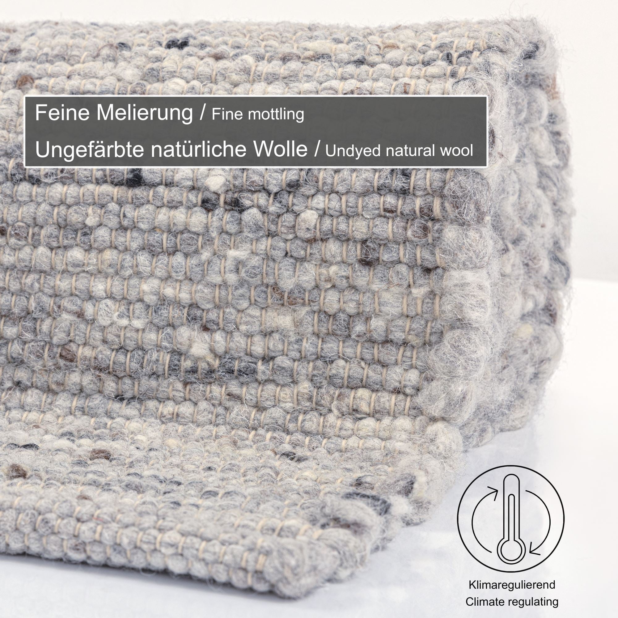Nos tapis chinés obtiennent leur aspect chiné unique en mélangeant habilement différentes nuances de laine naturelle de base comme le gris, le blanc de laine, le beige et le marron pendant le processus de filage. Veuillez noter qu'en raison des caractéristiques naturelles de la laine, de légères variations de couleur peuvent apparaître entre les lots de tapis tissés à la main.