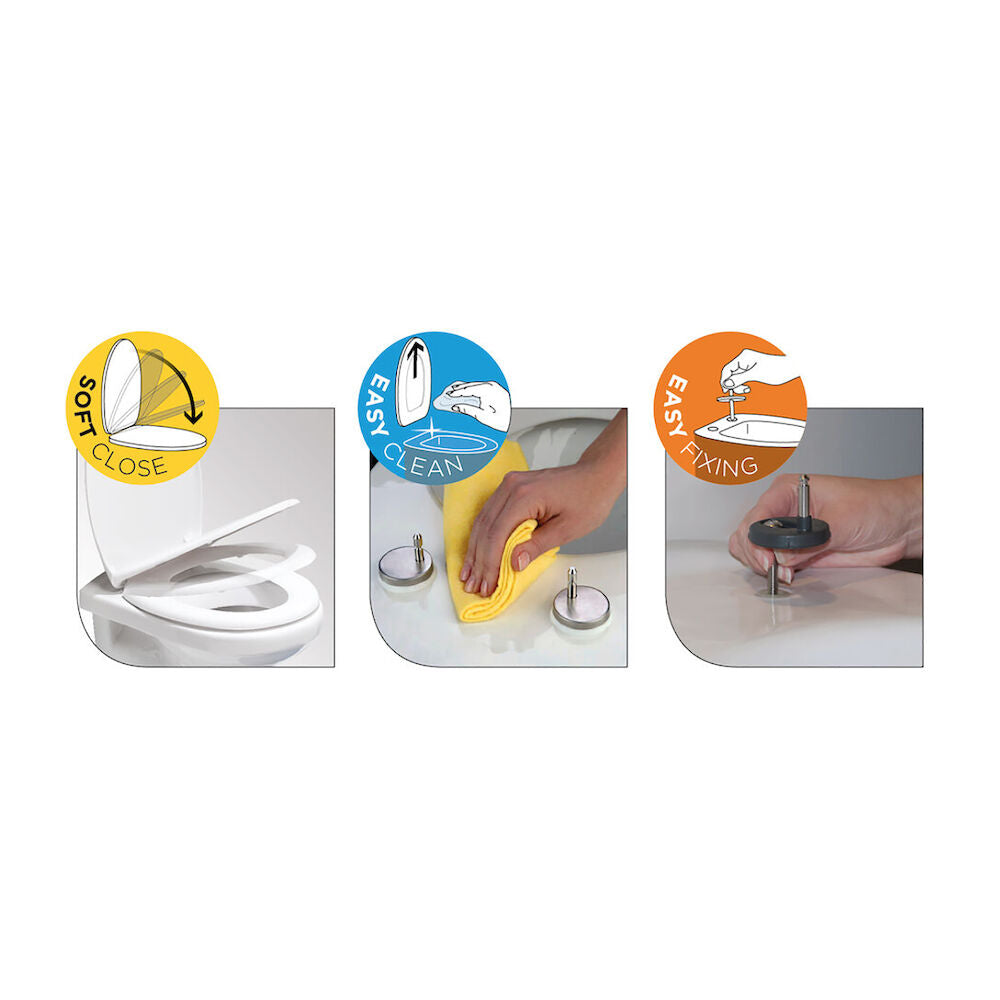- Easy Fixing: de toiletbril wordt bevestigd aan de bovenzijde van het toilet. Maakt schroeven nog sneller en makkelijker. Ook geschikt voor hangtoiletten