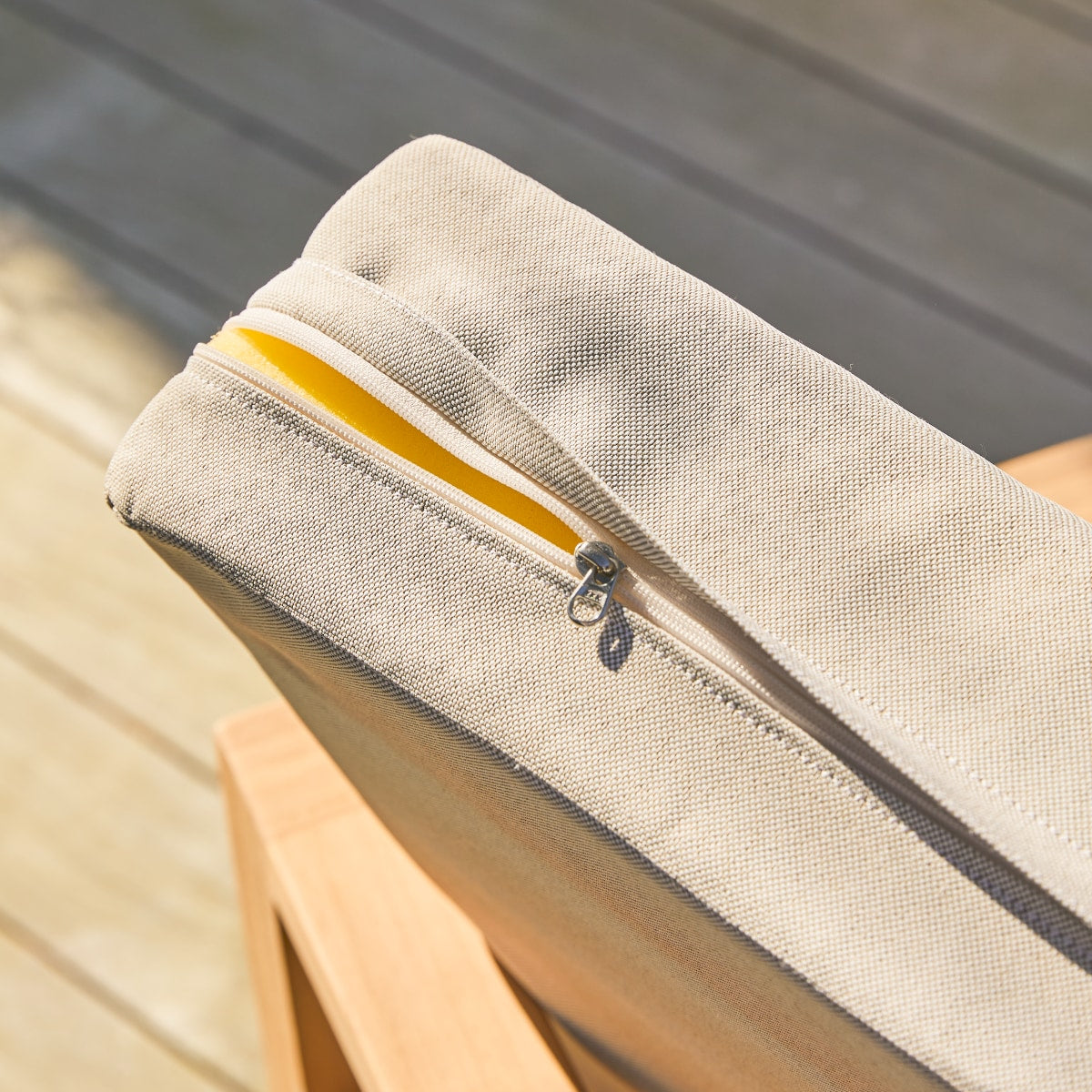 Het strakke ontwerp, de ruwe afwerking en de water- en zonbestendige kussens van olefin zorgen voor optimale ontspanning. Hij is veelzijdig, voelt zich zowel binnen als buiten volledig thuis en past perfect bij de Noah collectie.