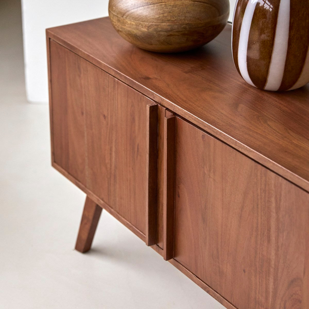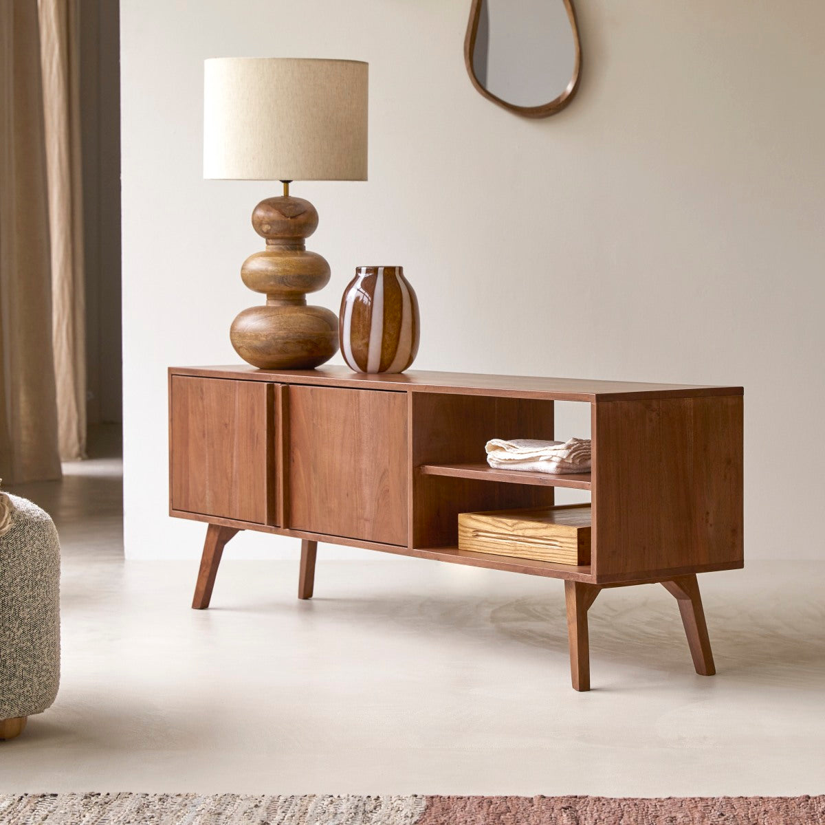 Het tv-meubel Niels van massief acacia is geïnspireerd op Scandinavisch design en meubilair uit de jaren 1950 en heeft strakke lijnen, is zeer functioneel en heeft evenwichtige proporties. De royale opbergruimte biedt functionele ruimte voor uw multimedia-apparatuur en bijpassende accessoires. Het is oorspronkelijk ontworpen voor de woonkamer, maar past ook harmonieus in andere woonruimtes zoals de woonkamer, de slaapkamer of het kantoor