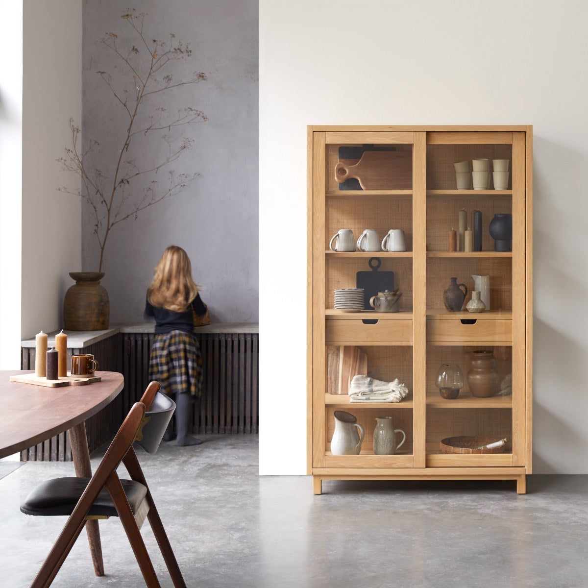 De Adel opbergkast van van het FSC®-gecertificeerde massieve eikenhout heeft sobere, tijdloze en betoverende ontwerplijnen en kan in elke kamer van het huis worden geplaatst: in de woonkamer als servieskast of om fraaie stapels tafellinnen in de zitkamer uit te stallen, in de slaap- of werkkamer als boekenkast met een zeer natuurlijke uitstraling of als vitrinekast om de mooiste voorwerpen een stofvrij plekje te geven.