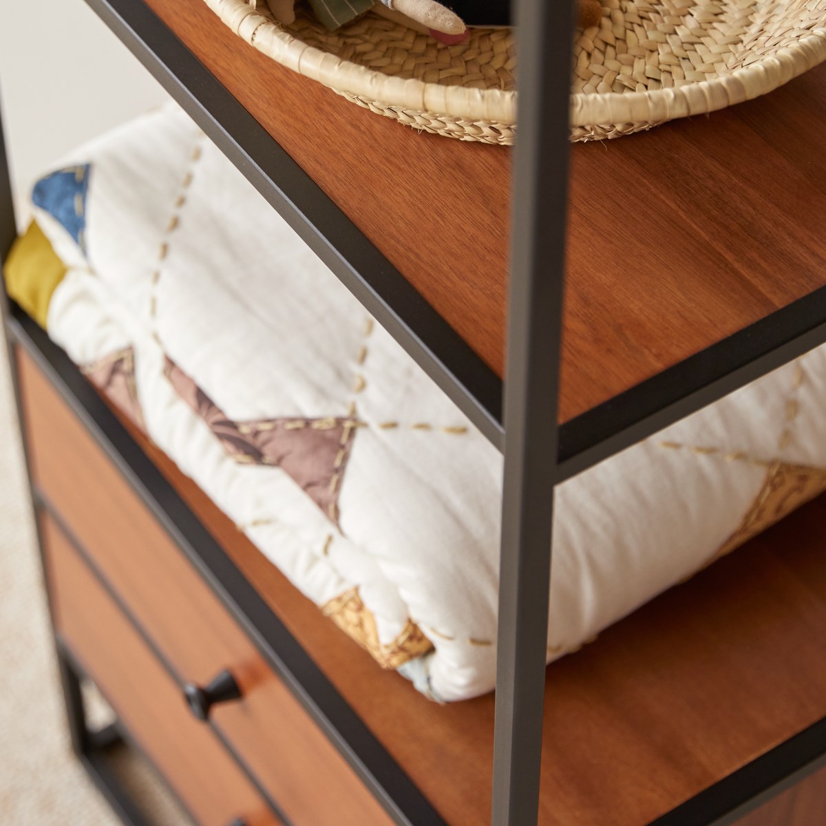 Stellingkast van massief acaciahout met FSC®-certificaat en metaal. Spelen in een kamer in industriële stijl nodigt uit tot avontuur. De wereld van een fabriek van weleer verkennen of in de diepten van de jungle duiken: er zijn geen grenzen aan de verbeelding bij het spel van ‘wat als’. Bordspellen staan in het midden van de plank om ze snel te kunnen pakken, de eerste kunstwerken van de woensdagmiddag bovenaan. Schatten vinden hun plaats in de laden, zodat jongere broertjes en zusjes niet op verkeerde ideeën komen. Als uw kind opgroeit, kan het schoolspullen of trofeeën opbergen in deze industriële stellingkast met veel persoonlijkheid.