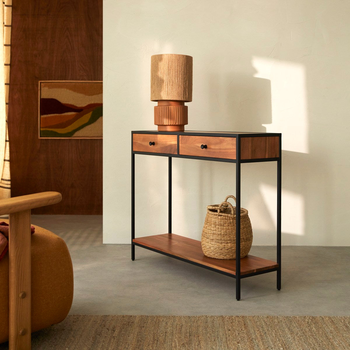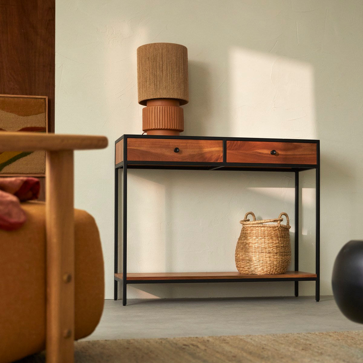 Dit kleine meubel is direct geïnspireerd door de oude fabrieken en drukt zijn mooie soberheid perfect uit in de woonkamer, in een hal of in de eetkamer... In de laden leggen we al die kleine voorwerpen die we niet willen zien rondslingeren, maar die toch essentieel zijn voor ons dagelijks leven: Sleutels, post, pennen, kladpapier... Voor een nog geslaagder decoratief effect kunt u, zoals op onze foto, verschillende soorten planten toevoegen of decoratieve voorwerpen, fotolijstjes... U kunt het ook een meer praktische functie geven en er een klein bureau van maken. Waar u het meubel ook voor gebruikt, de Agra bijzettafel van metaal en acacia geeft uw huis een vintage look die zeer gewaardeerd wordt in de hedendaagse decoratie.