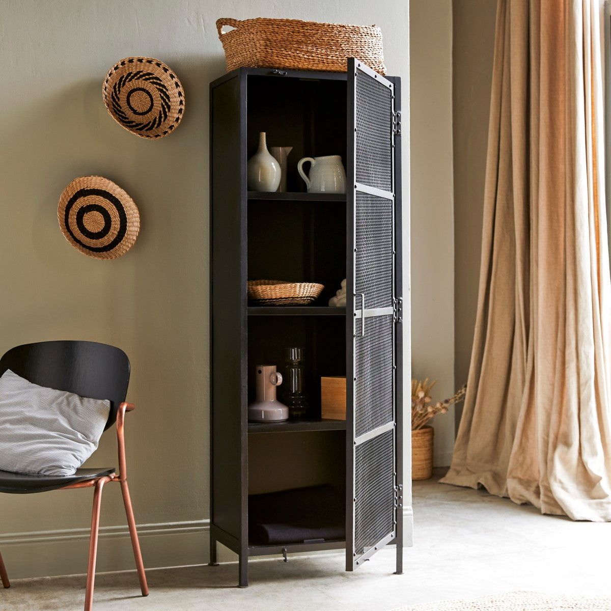 De Alma kast met metaalgaas past perfect bij het industriële metalen bureau of het dressoir om een vintage kamer te creëren. Het meubel kan ook worden gecombineerd met uw huidige inrichting: De industriële stijl kan worden doorgevoerd in de inrichting van een complete kamer of enkel een detail zijn.
