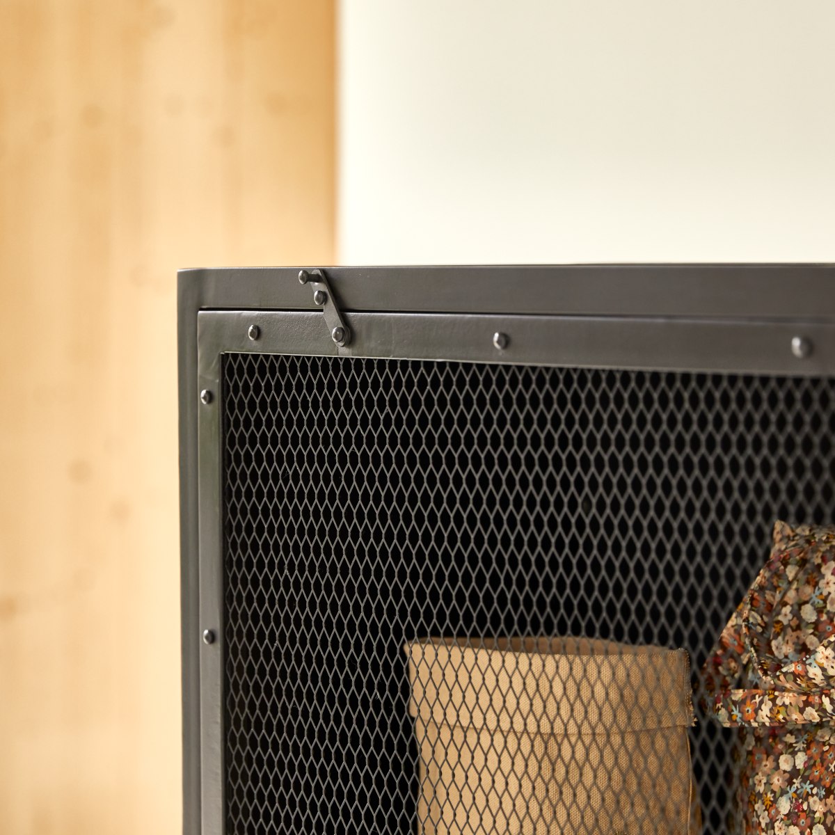 Ouders zullen dol zijn op de workshopstijl van kledingkast Alma met metaalgaas, op de sobere vintage uitstraling en de grote opbergcapaciteit die maar weinig ruimte in beslag neemt.
