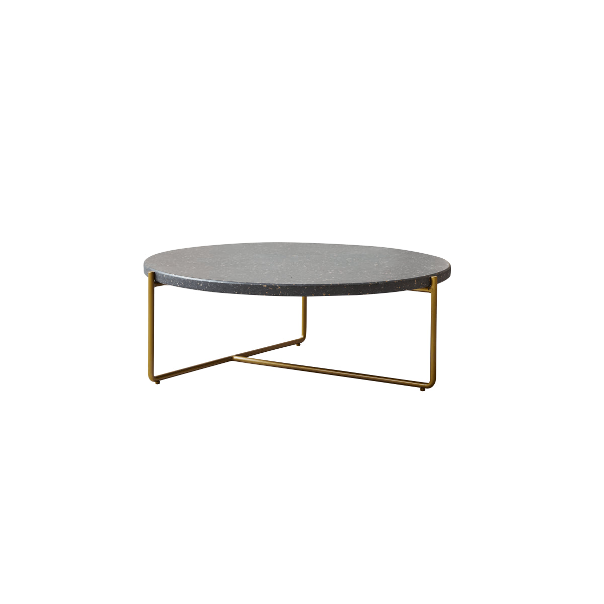 De 80 Anatole grey salontafel van messing en terrazzo, zeer origineel en vol persoonlijkheid, combineert op briljante wijze een zeer eigentijdse geest, minimalistisch design en afgeronde lijnen.