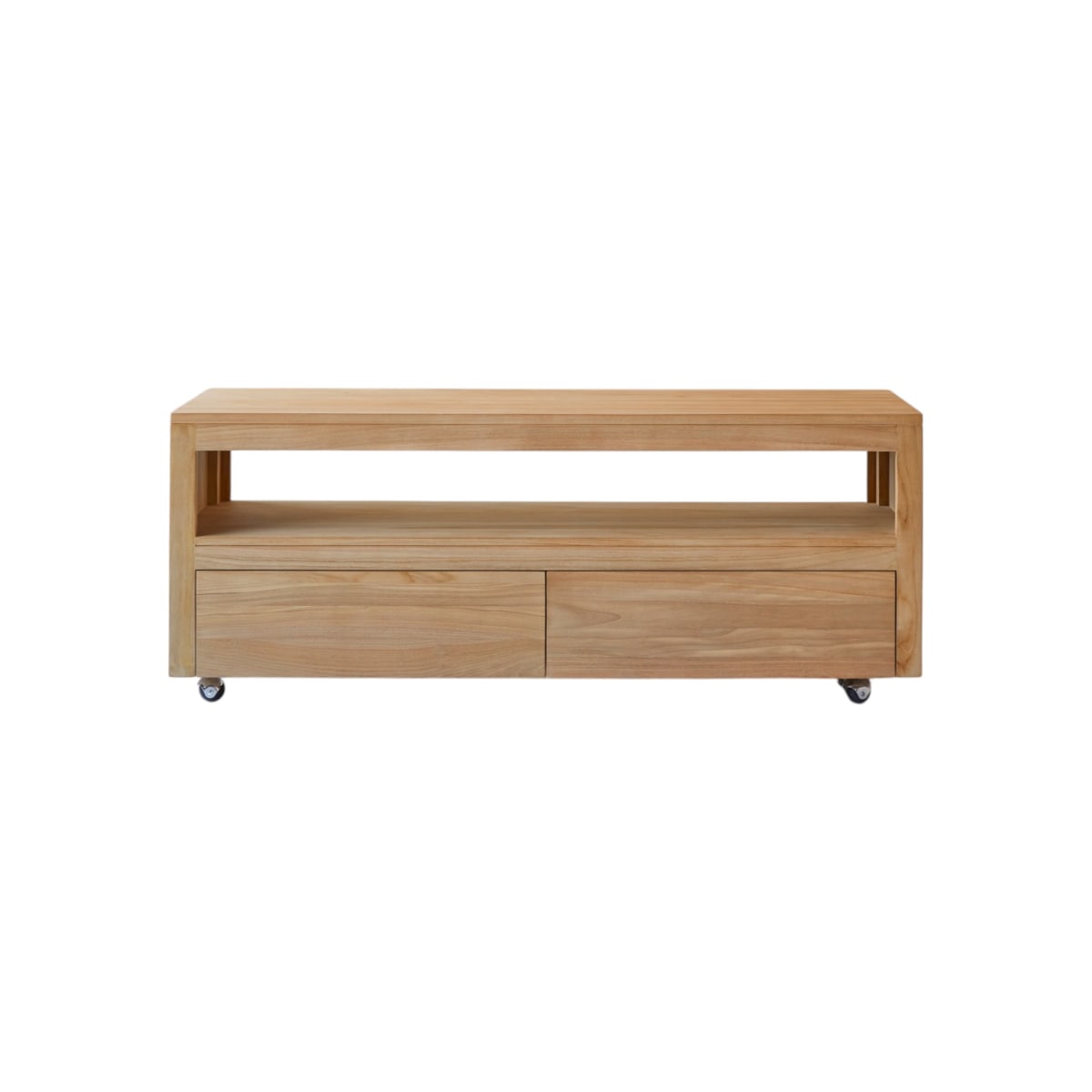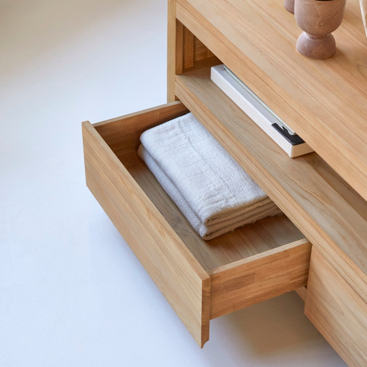 Dit 140 Anoa tv-meubel van teak heeft 2 grote laden en een open vak.