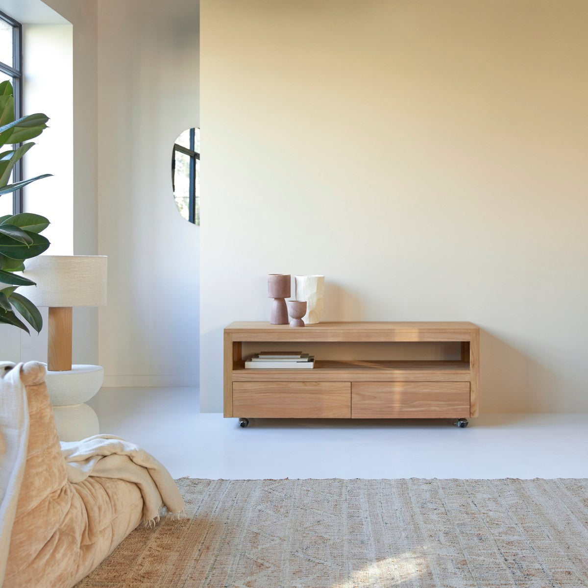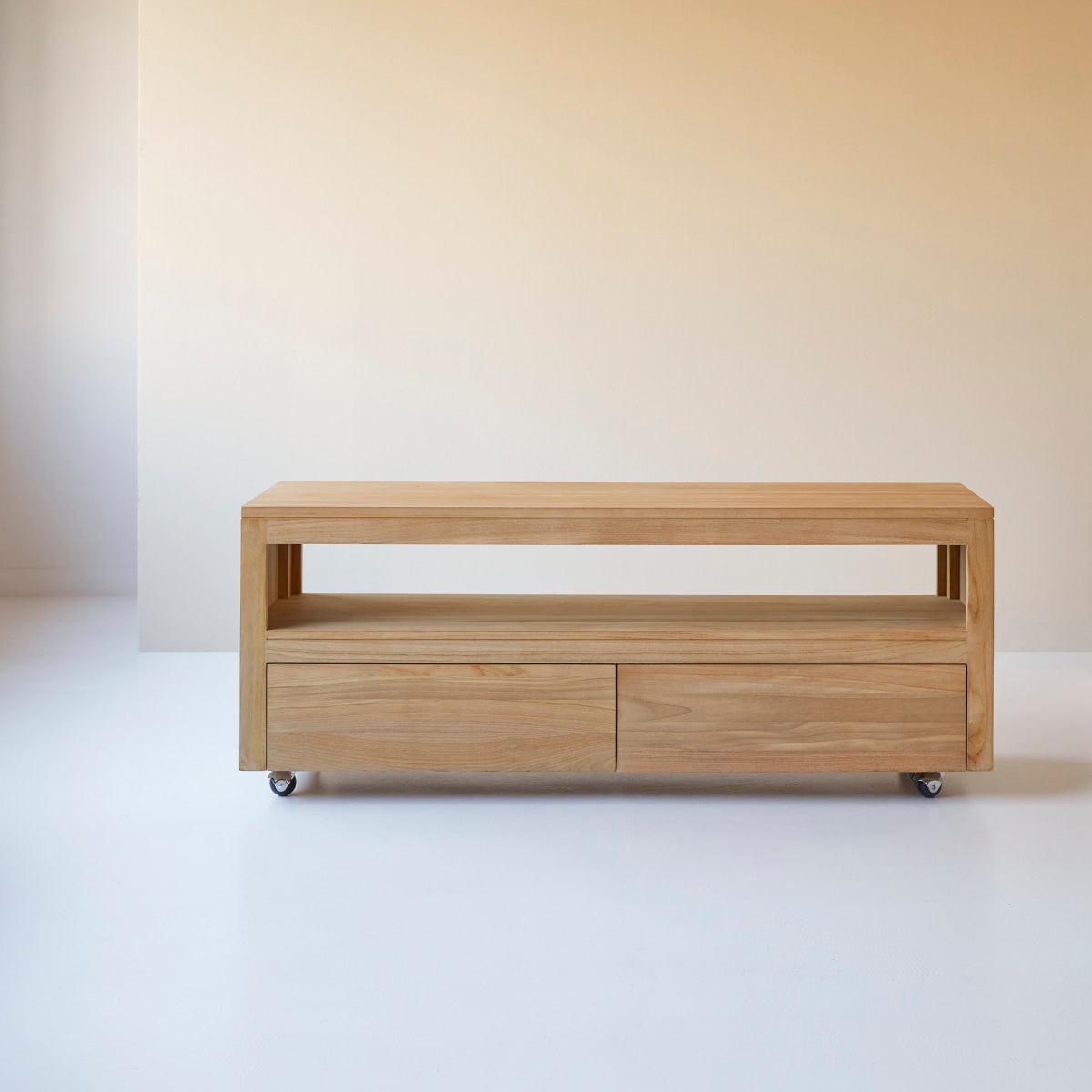 Zeer mooi tv-meubel van massief FSC® teakhout op wielen. Laat u charmeren door zijn ultra hedendaagse stijl en zijn hoogwaardige afwerking!