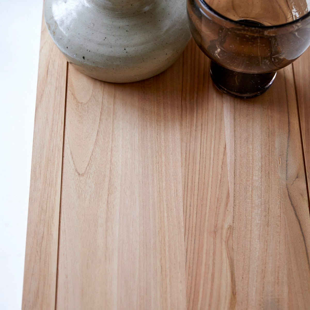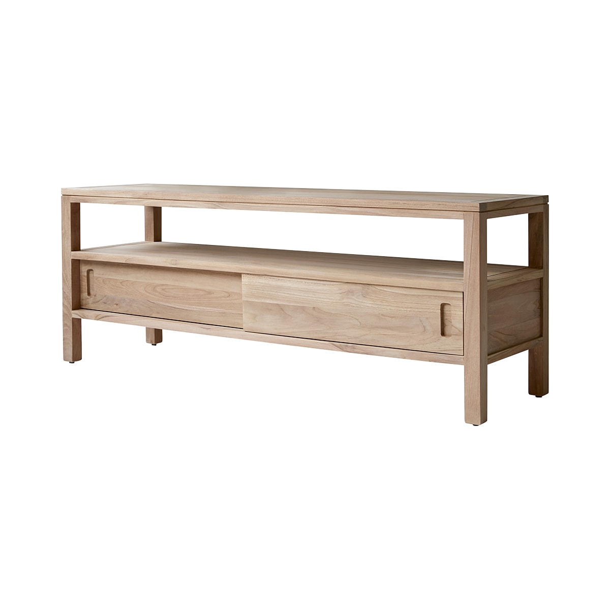 Het tv-meubel Anton 130 is gemaakt van massief teakhout. Uitgerust met een open vak en 2 schuifdeuren, een perfect opbergmeubel voor in de woonkamer. De elegante en natuurlijke stijl zal in de smaak vallen: Een sober ontwerp gekenmerkt door eenvoudige lijnen, een lichte kleur en een natuurlijke afwerking van het teakhout.
