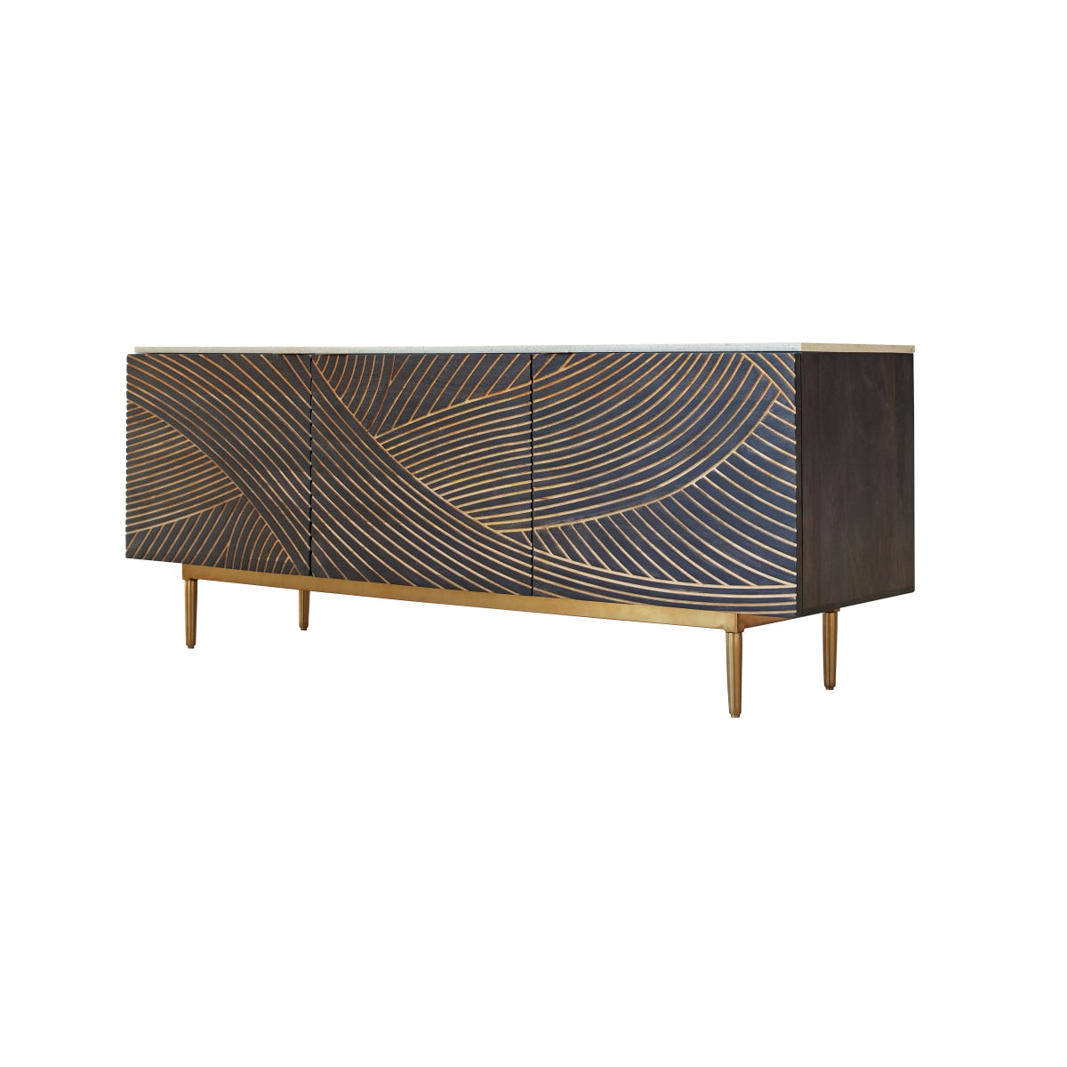 Let op de originele handgrepen in messinglook, de verfijnde elegantie van het frame (ook in messinglook), dat het geheel optisch verzacht, en de royale opbergruimte. Afgewerkt met getinte lak.