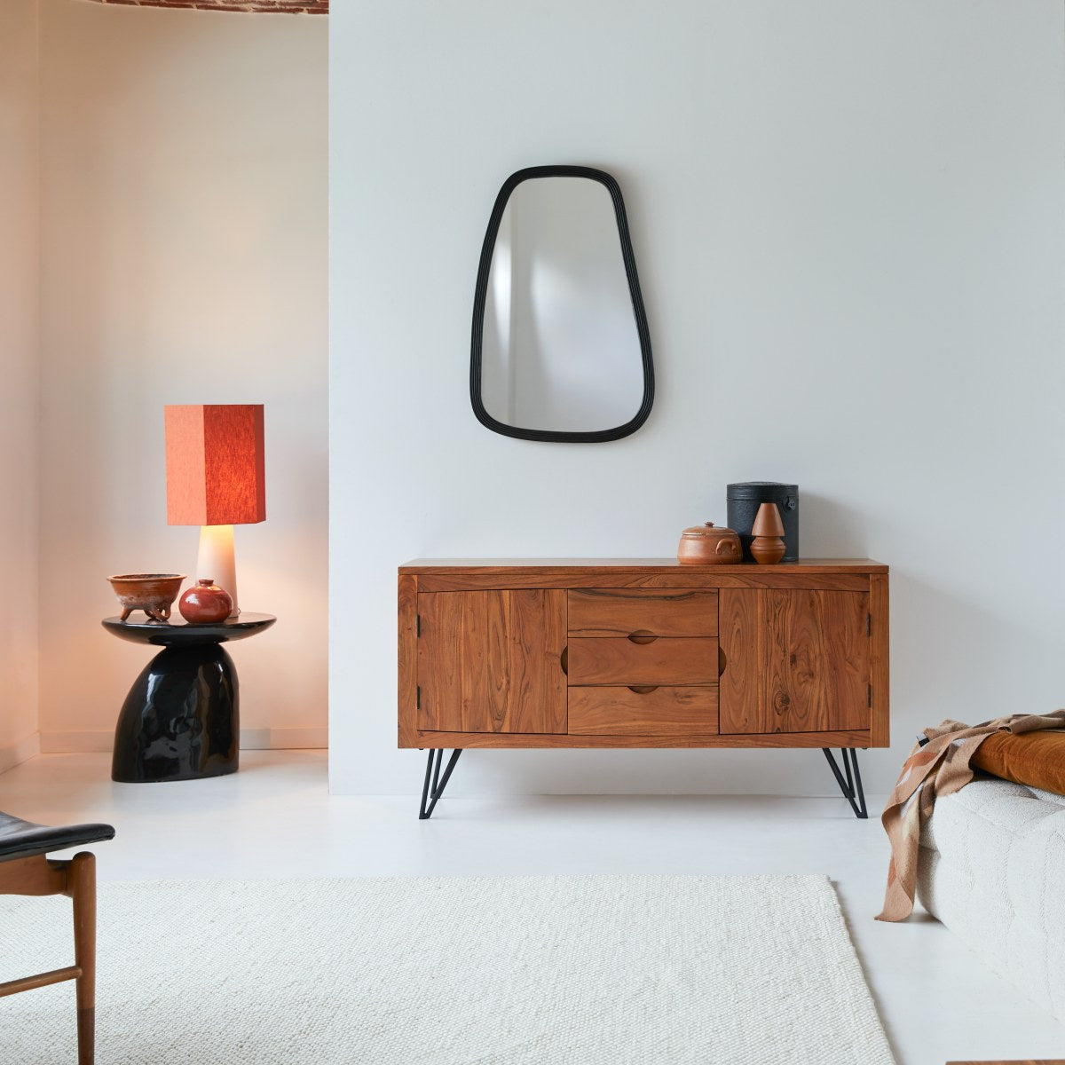 Het buffet Bonnie van massief acaciahout heeft een moderne uitstraling, maar het minimalistische ontwerp maakt het tot een tijdloos meubelstuk dat dag na dag weet te overtuigen. Let op de verfijnde metalen poten en de goudbruine reflecties van het massieve hout.