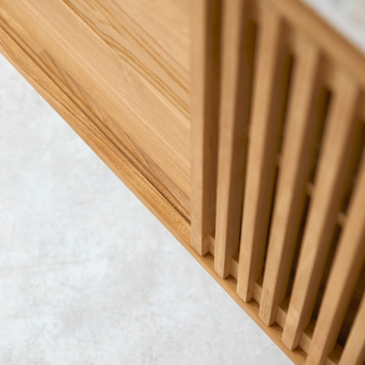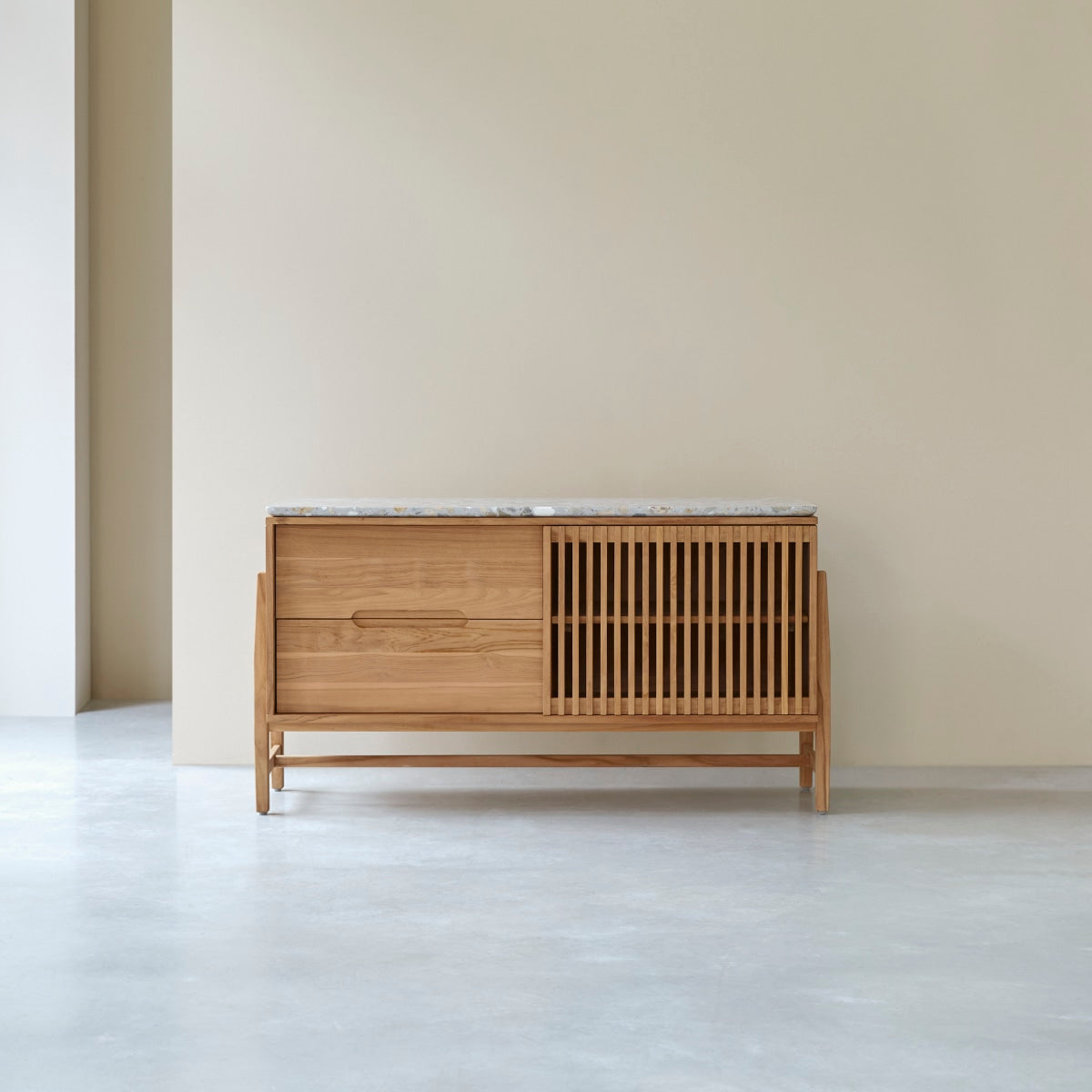 De Isaure buffetkast combineert FSC®-gecertificeerd massief teakhout en premium terrazzo in een duurzaam en elegant ontwerp. Met zijn lamellendeur en makkelijk schoon te maken, schokbestendige bovenblad past hij echt overal: woonkamer, eetkamer, keuken. Hij wordt gemonteerd geleverd en is overal in huis van praktisch nut, met een extra vleugje stijl erbovenop.