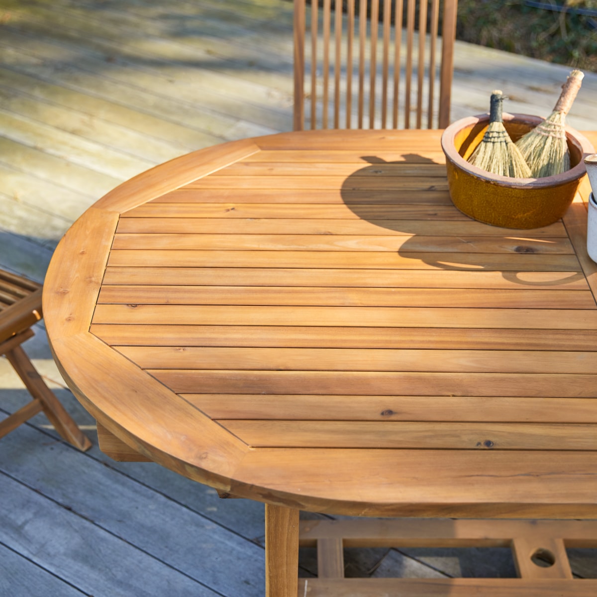 De massief acaciahouten tuinset is ideaal om uw tuin en terras in te richten en wordt hier gepresenteerd in een maxi-versie: een grote ovale Capri-tafel met een eenvoudig te gebruiken centraal verlengblad voor maximaal 9 gasten, en 8 bijpassende stoelen. Perfect om van het mooie weer te genieten en gezellige momenten te delen met familie en vrienden! Dankzij deze royale set met prachtige latten wordt de buitenruimte een echte leefruimte waar vrienden en familie samen fijne momenten kunnen doorbrengen.