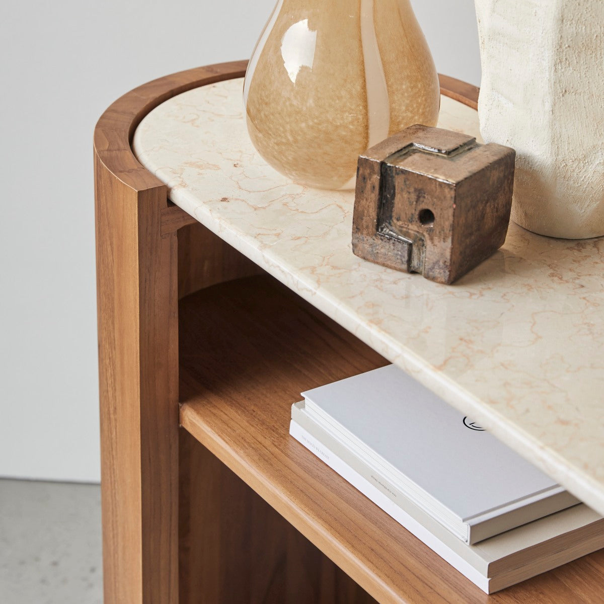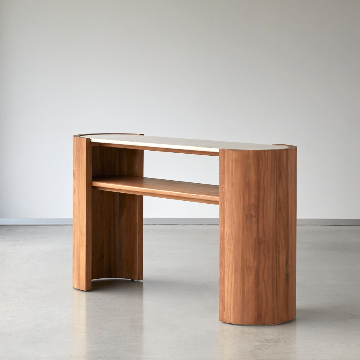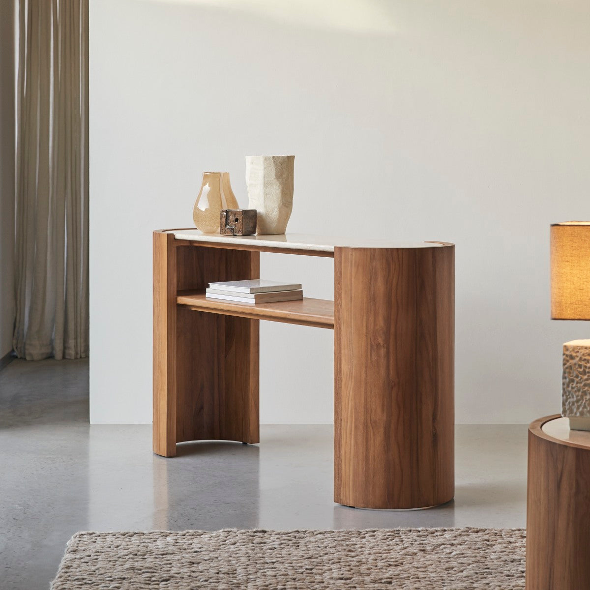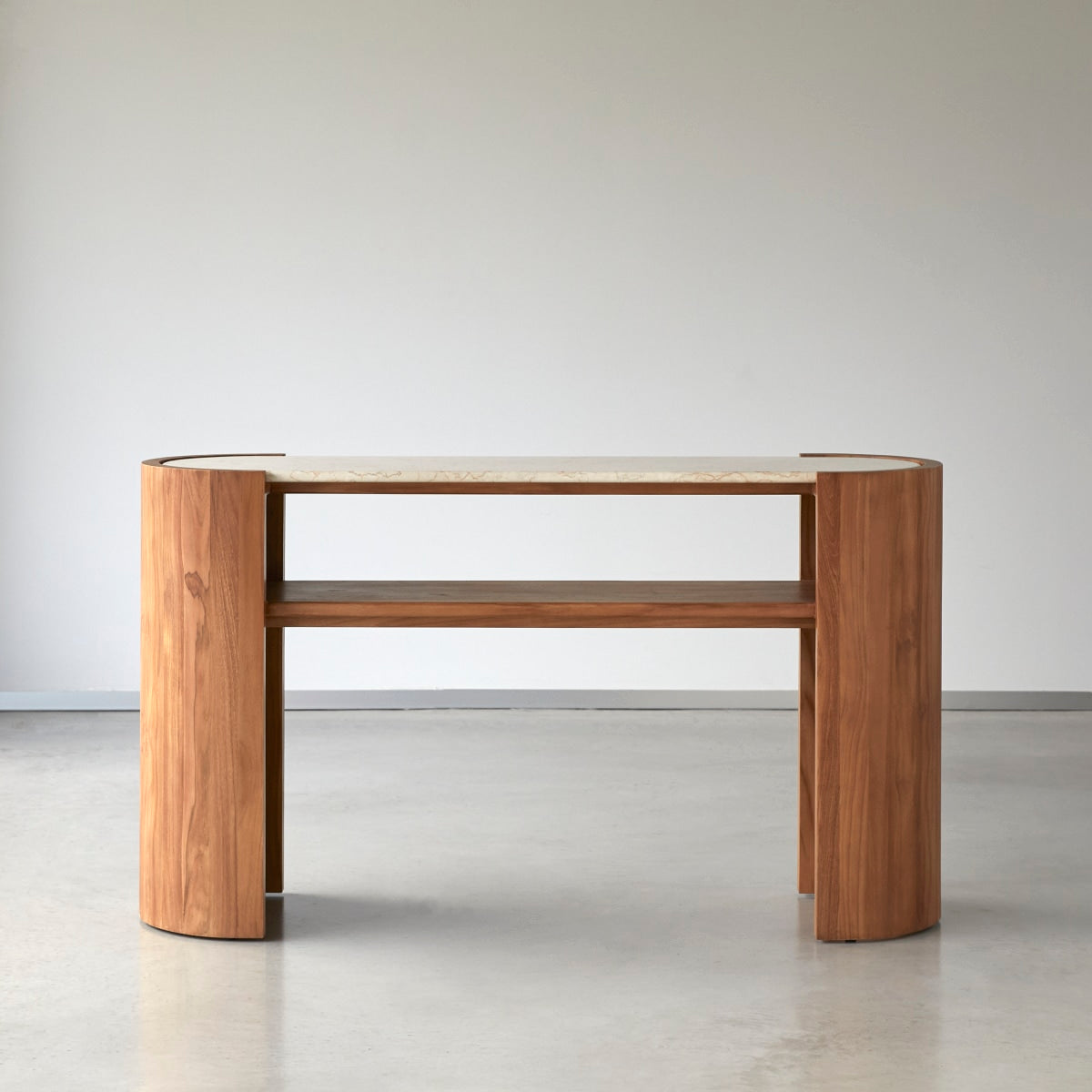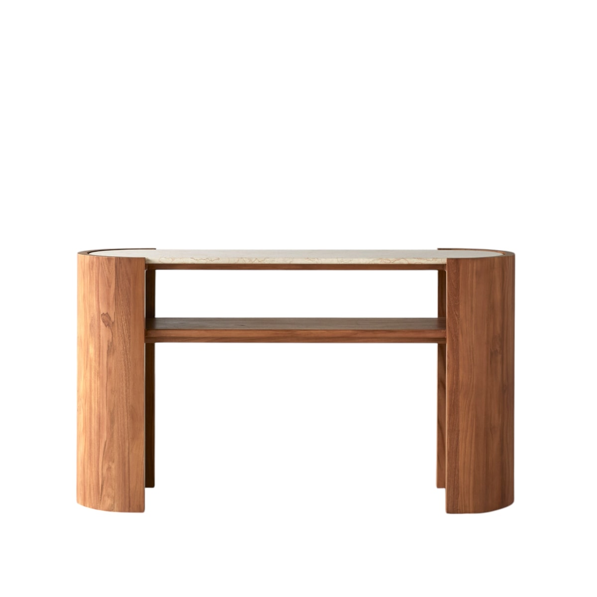 De Virgile consoletafel in massief teak en marmer is zowel elegant als functioneel met zijn strakke lijnen en dubbele blad, dat van pas komt om spullen op te bergen en uit te stallen. Het natuurlijke teakhout en het verfijnde marmer passen harmonieus in verschillende interieurs.