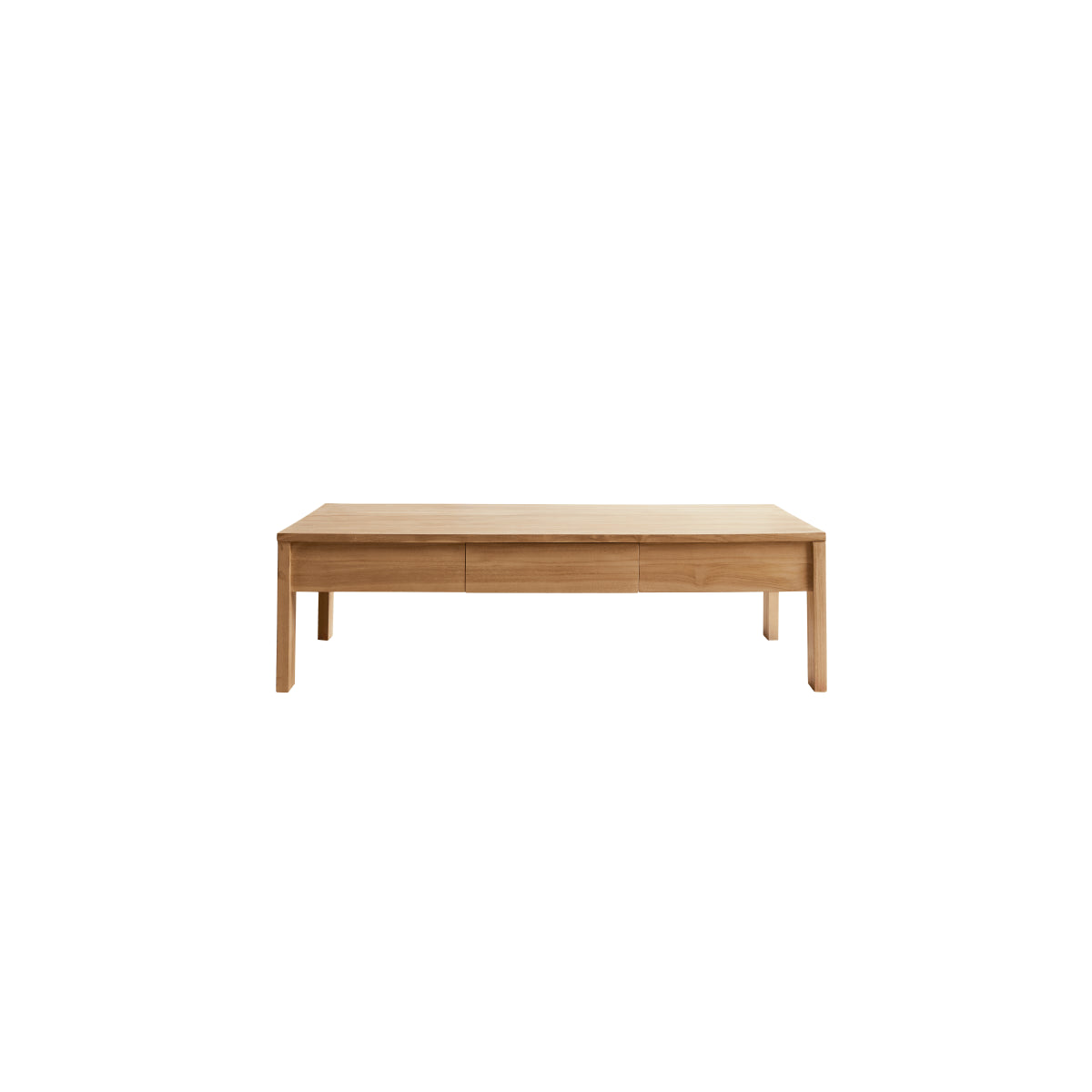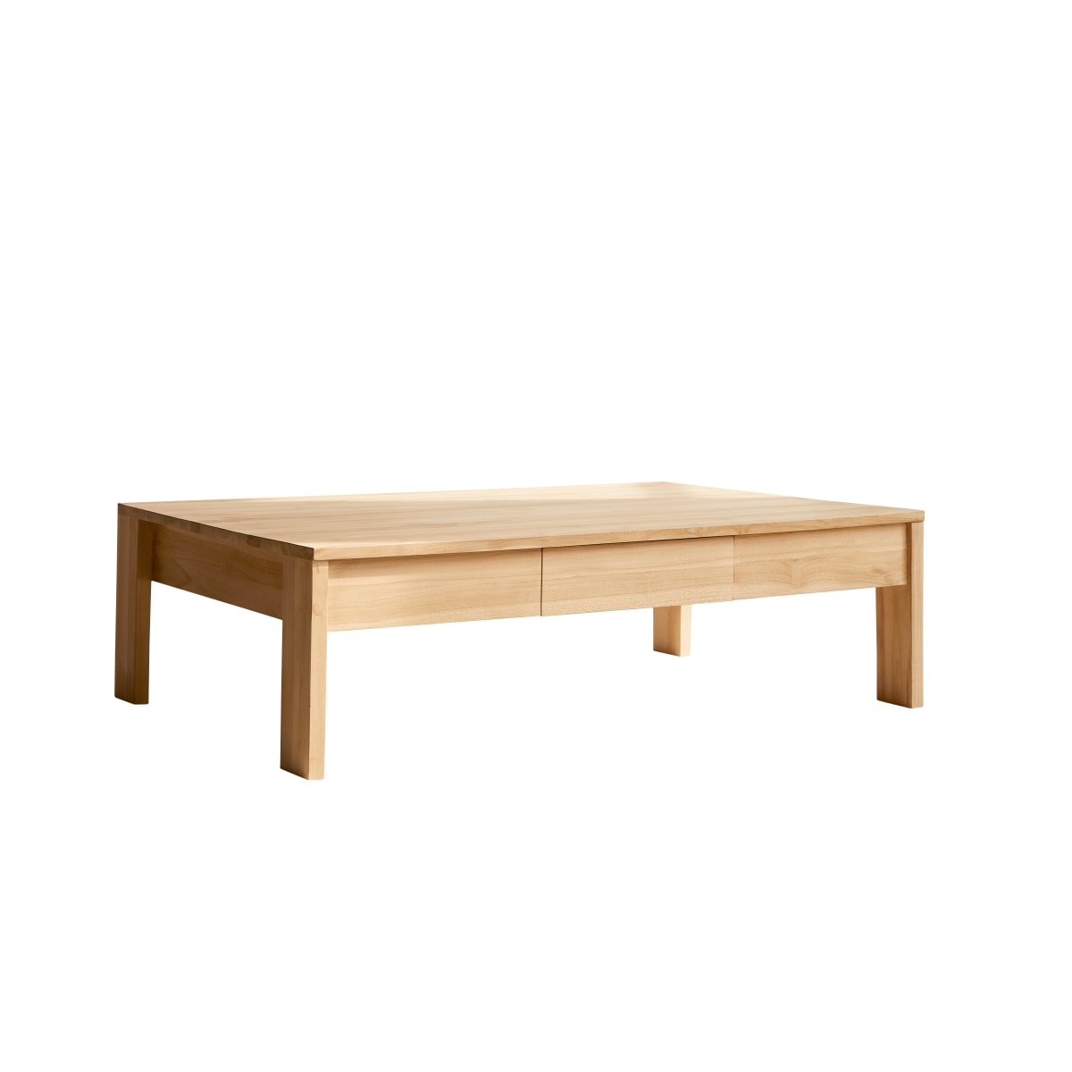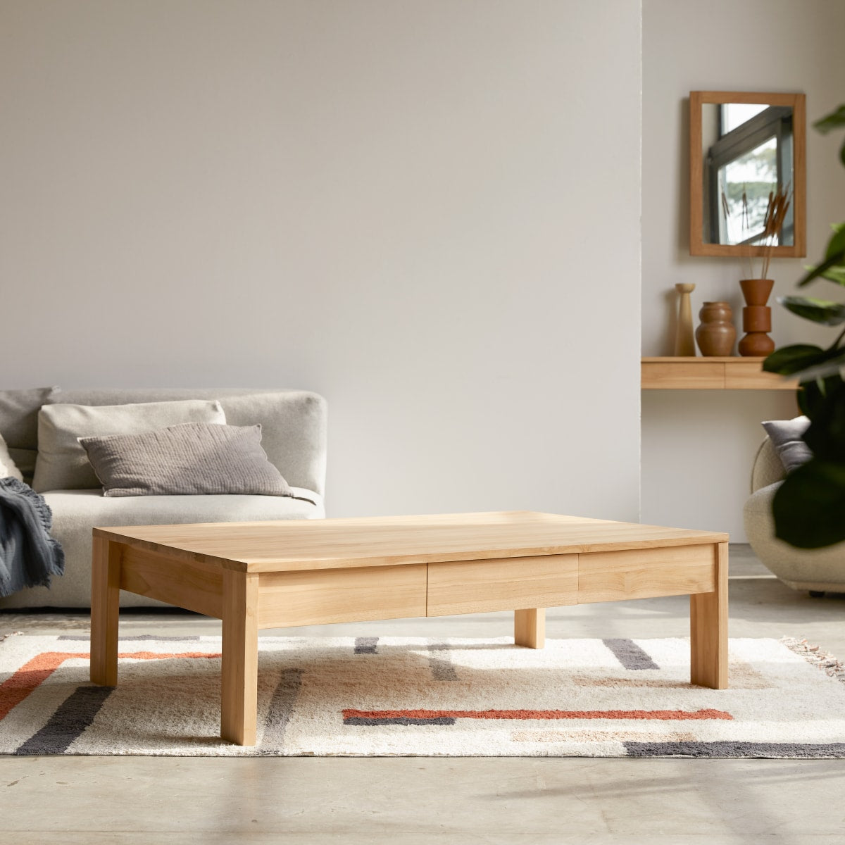 Grote salontafel van natuurlijk lichtbruin massief teakhout met een sterk karakter. De grote lade houdt afstandsbedieningen en andere gadgets uit het zicht. Deze teak salontafel kan als uniek meubelstuk gewaardeerd worden of deel uitmaken van een set. Het volledige assortiment is te koop op Tikamoon.