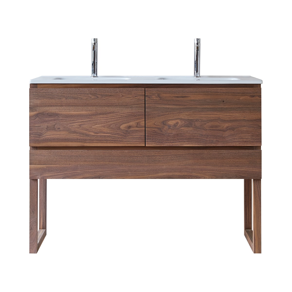 Het Edgar badkamermeubel van massief walnoothout en keramiek is gemaakt van een houtsoort dat een visueel effect heeft dankzij de zeer zichtbare nerven en met olie is afgewerkt om het gebruiksvriendelijk te maken in het dagelijks leven. Het is verkrijgbaar in een enkele uitvoering voor kleine badkamers.
