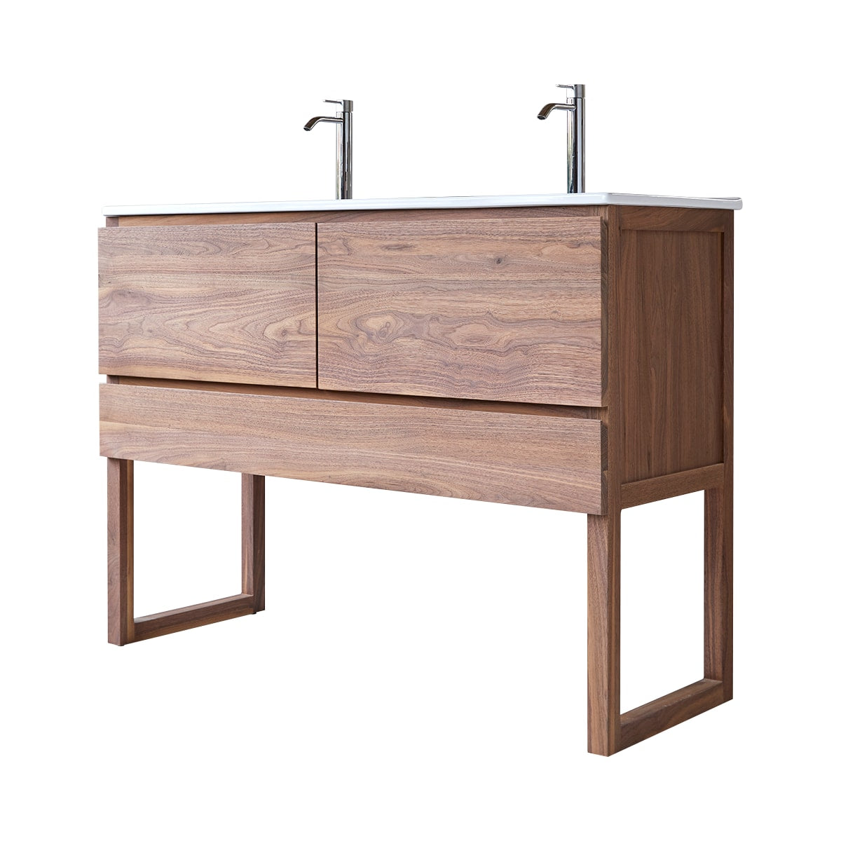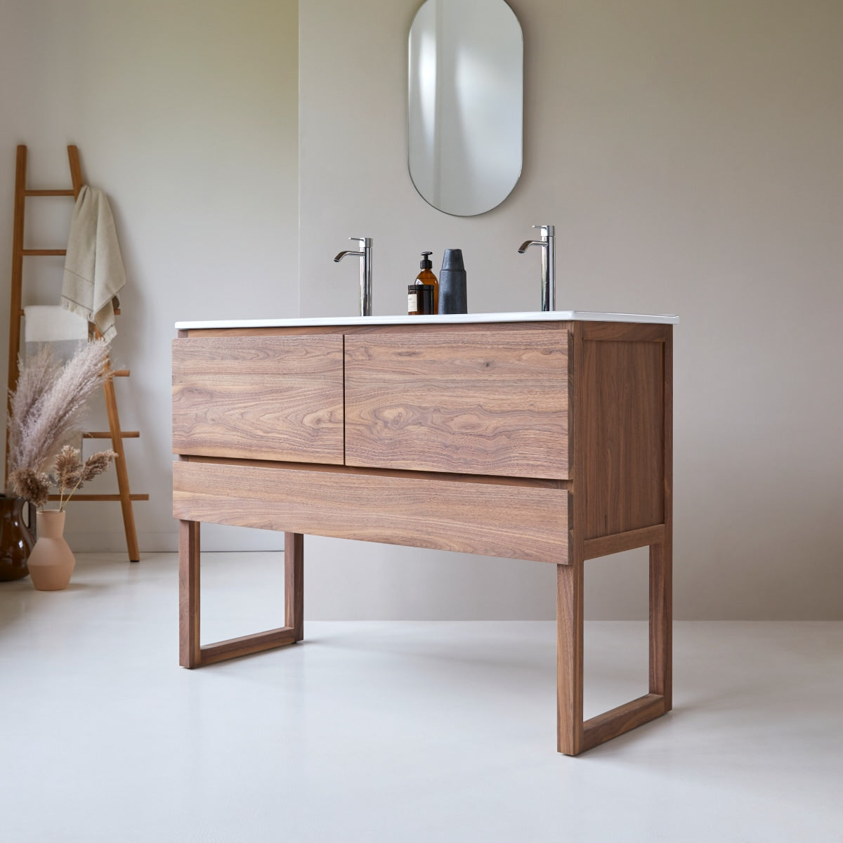 Een elegant, authentiek en zeer visueel meubel met een royale opbergruimte: een Edgar badkamermeubel van massief FSC®-walnoothout en keramiek dat op alle punten het hoogste scoort!