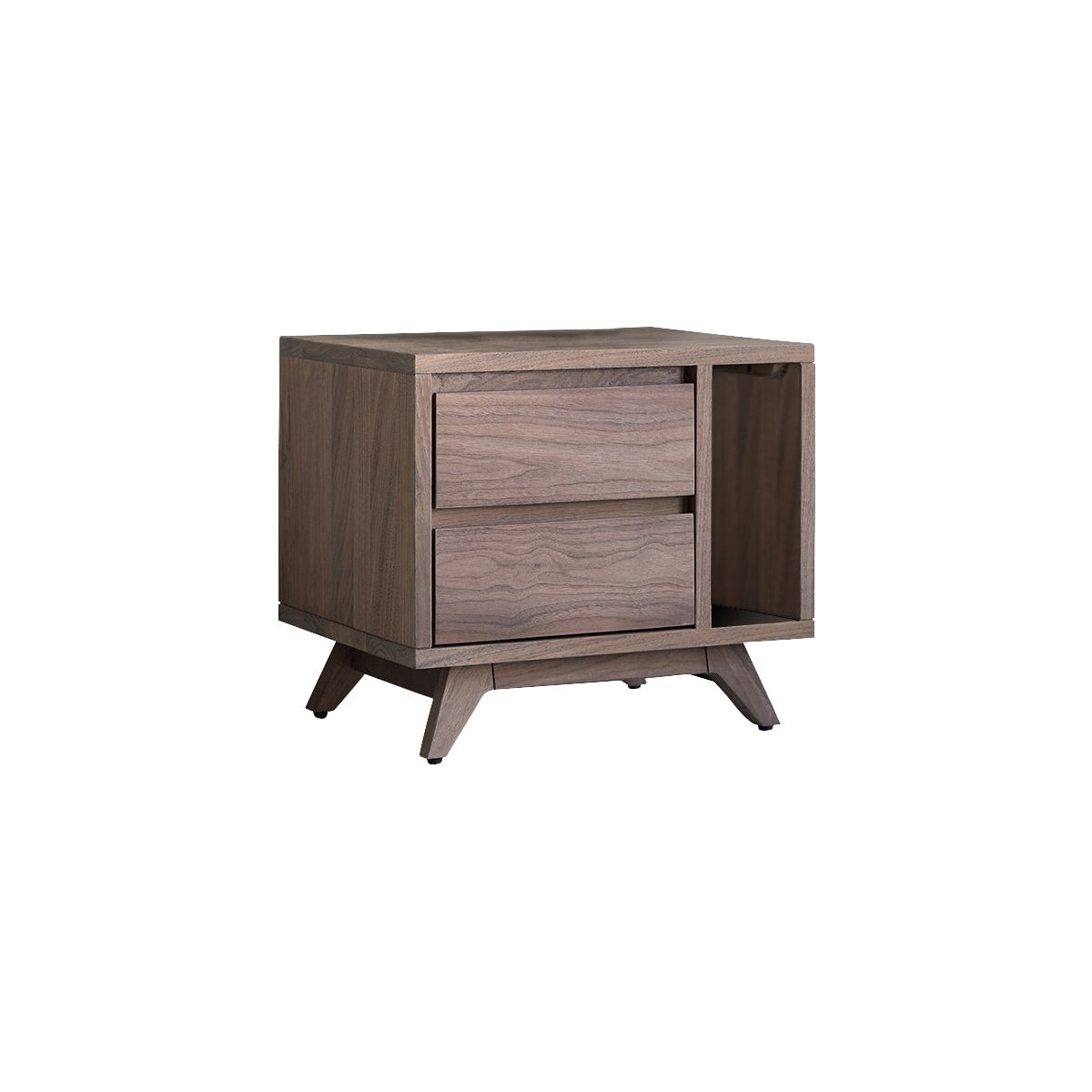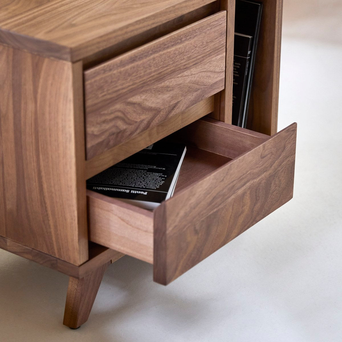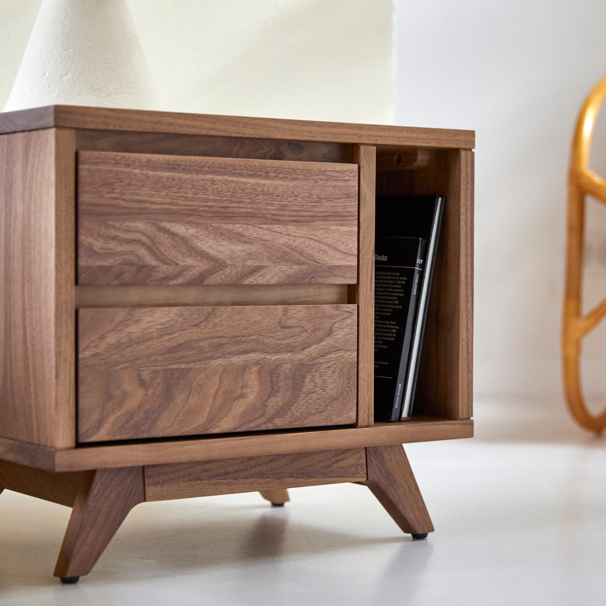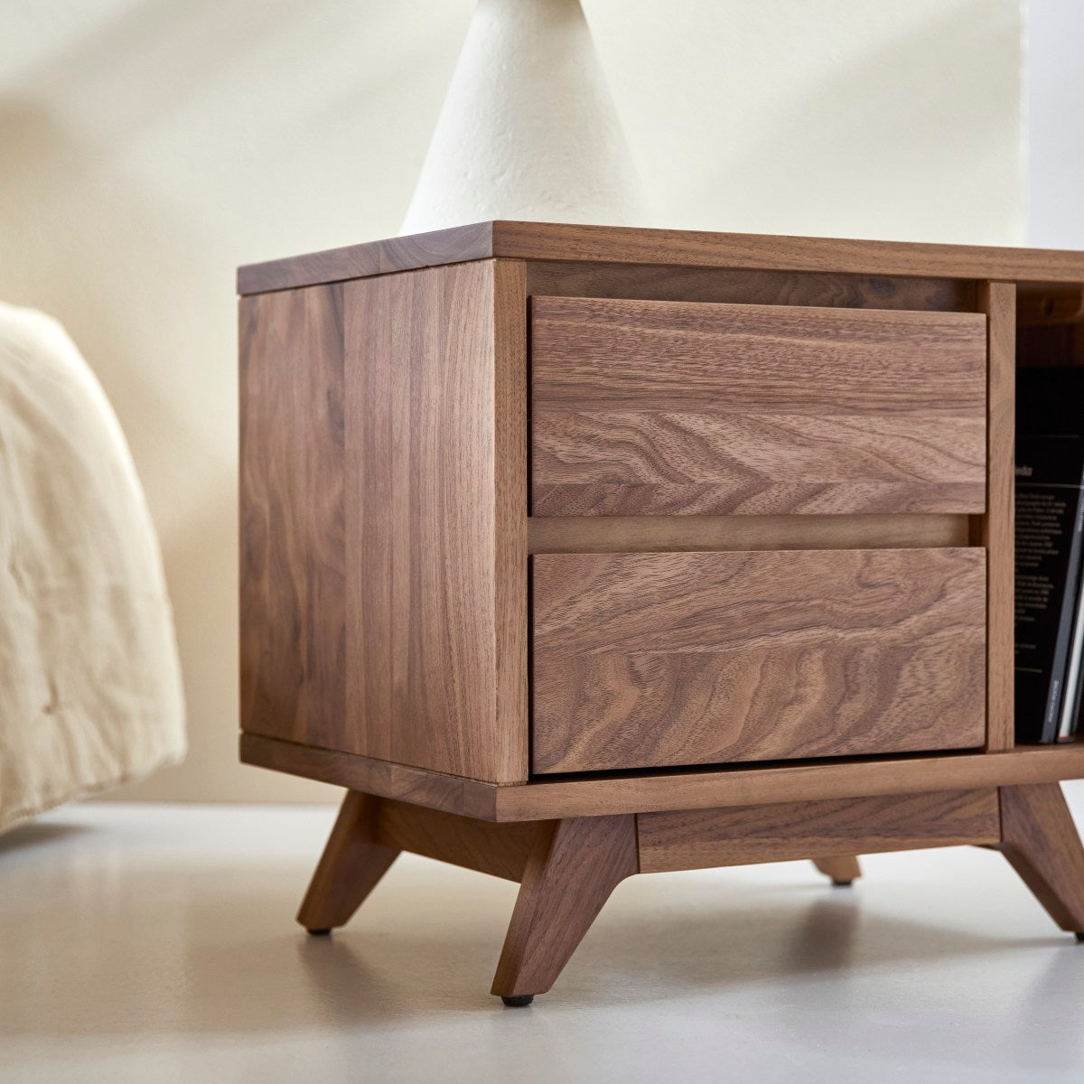 Het nachtkastje Esmée van massief notenhout heeft veel te bieden: wij houden van het nobele hout met gouden weerspiegelingen, de mooie zichtbare nerven, de vintage geïnspireerde lijnen en de opbergcapaciteit... zeldzaam voor dit soort kleine meubels. Het biedt namelijk 2 ruime laden en 1 vak: om alles wat u nodig hebt bij de hand te houden voor de avond of nacht.