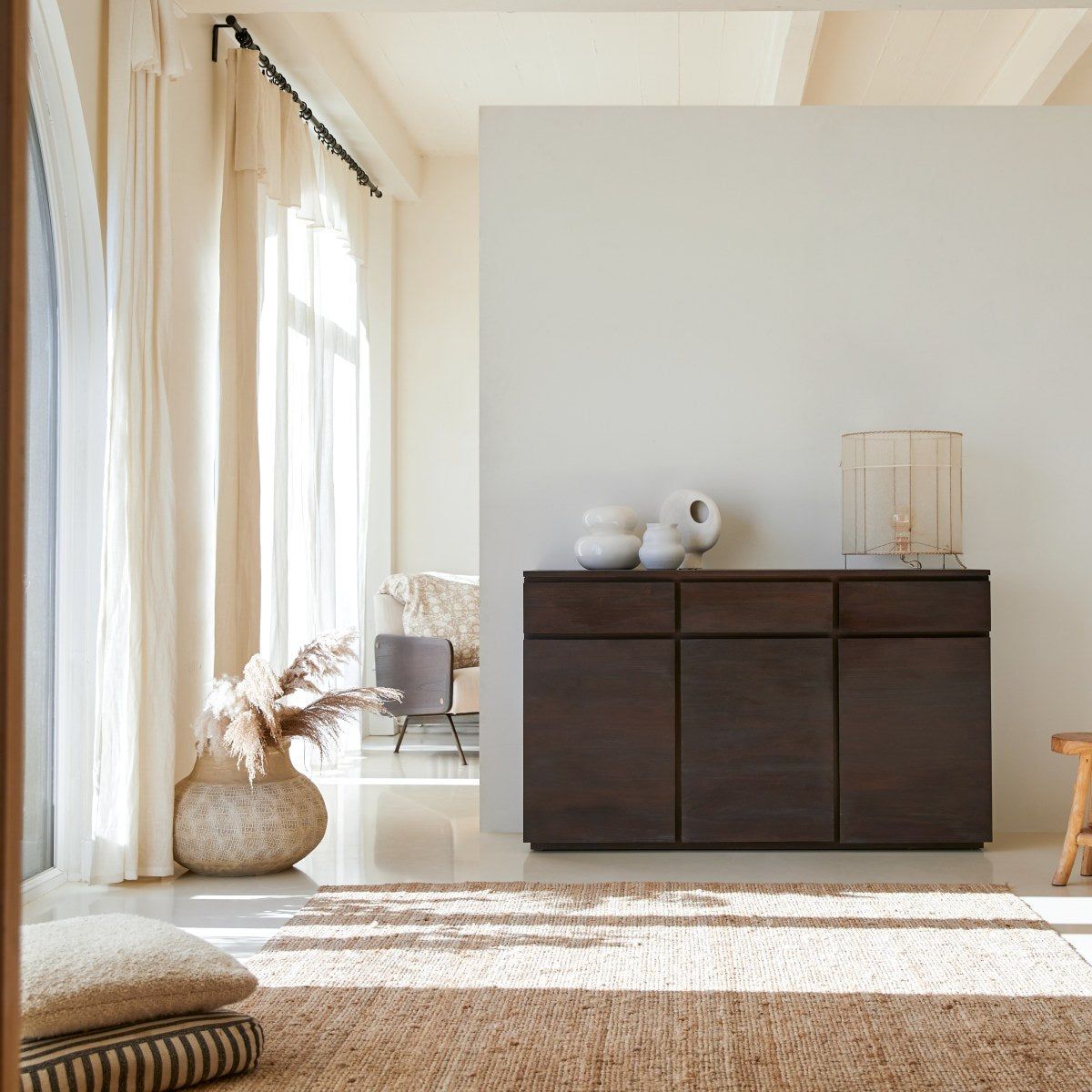 U valt gegarandeerd voor het geborstelde hout en de ruime opbergcapaciteit. Met zijn jaren 50-look past dit model in elk interieur en biedt het vele gebruiksmogelijkheden: in de eetkamer of woonkamer om borden, drankflessen of tafellinnen op te bergen, in de slaapkamer voor beddengoed en handdoeken, of in de werkkamer voor dossiers en andere accessoires die u niet wilt laten rondslingeren.
