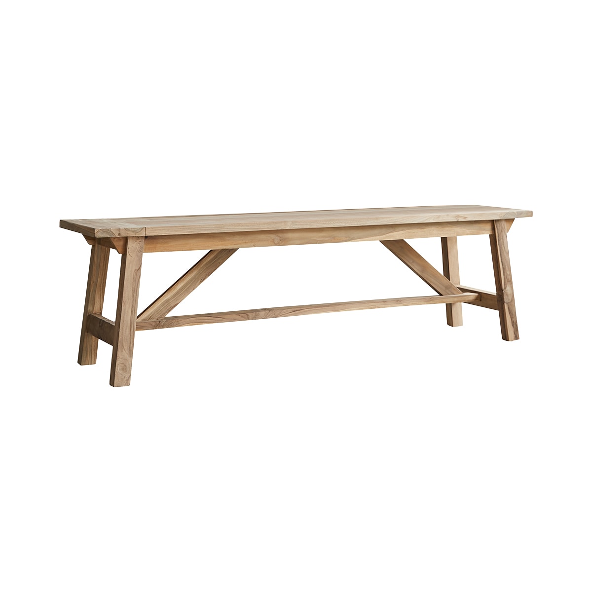 De Filipe-bank van gerecycled teakhout kan worden gebruikt als decoratiemeubel, zoals op onze foto: In de slaapkamer wordt het een bedeinde en in een ruime hal kan het worden gebruikt om tassen, sjaals of schoenen op te zetten. Kortom: het stuk voldoet aan alle eisen van uw interieur!