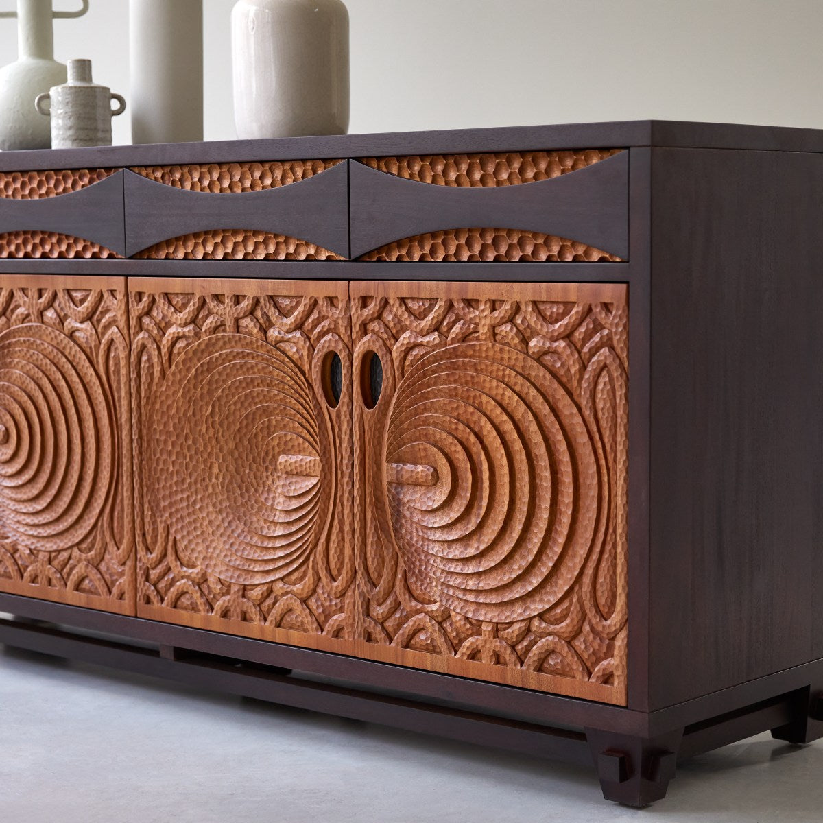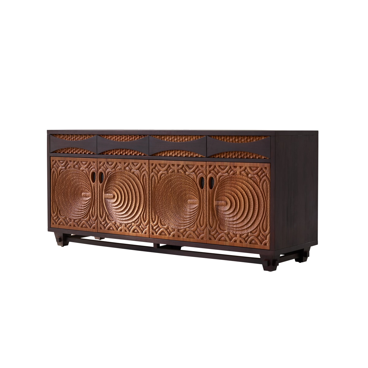 Bijna een kunstwerk in huis! Deze prachtige buffetkast Frida in massief mahoniehout valt op door zijn originele stijl, het perfecte houtsnijwerk van de prachtige deuren en de etnische stijl, waardoor u zin krijgt om op reis te gaan zonder uw huis te verlaten! Dit atypische meubelstuk met zijn royale opbergcapaciteit zal veel karakter toevoegen aan uw huis: in de woonkamer, de eetkamer of zelfs in de keuken of een ruime hal, het is een echte blikvanger met zijn ongebruikelijke ontwerp! Het houtwerk wordt versterkt door een prachtig tweekleurig effect en de FSC® certificering van het massieve mahonie garandeert dat het hout afkomstig is uit duurzaam beheerde bossen. Hij is beschermd met een laklaag voor dagelijks gebruiksgemak.