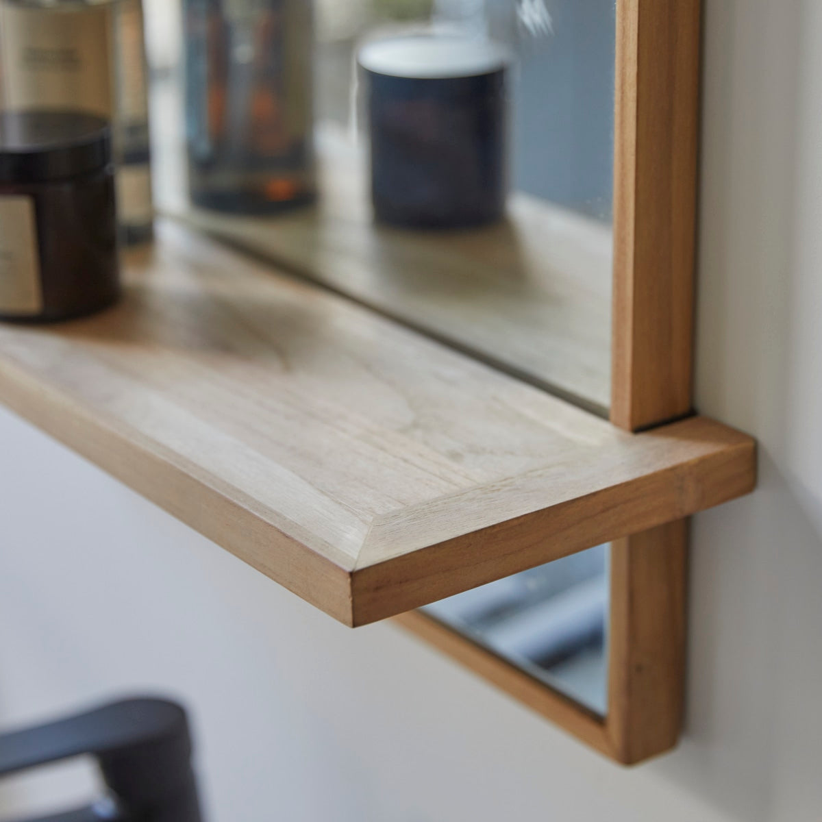 Versier uw badkamer met onze Galyno wandspiegel van 75x45 cm van teakhout: de elegantie met de dunne houten lijst zal een chique decoratieve touch brengen. Met deze zowel esthetische als functionele spiegel kunt u dankzij het blad dat als rekje fungeert, uw schoonheidsproducten uitstallen. Onze spiegel is ideaal voor een badkamer met een pure hedendaagse stijl. Dankzij het ophangsysteem kunt u het gemakkelijk plaatsen.