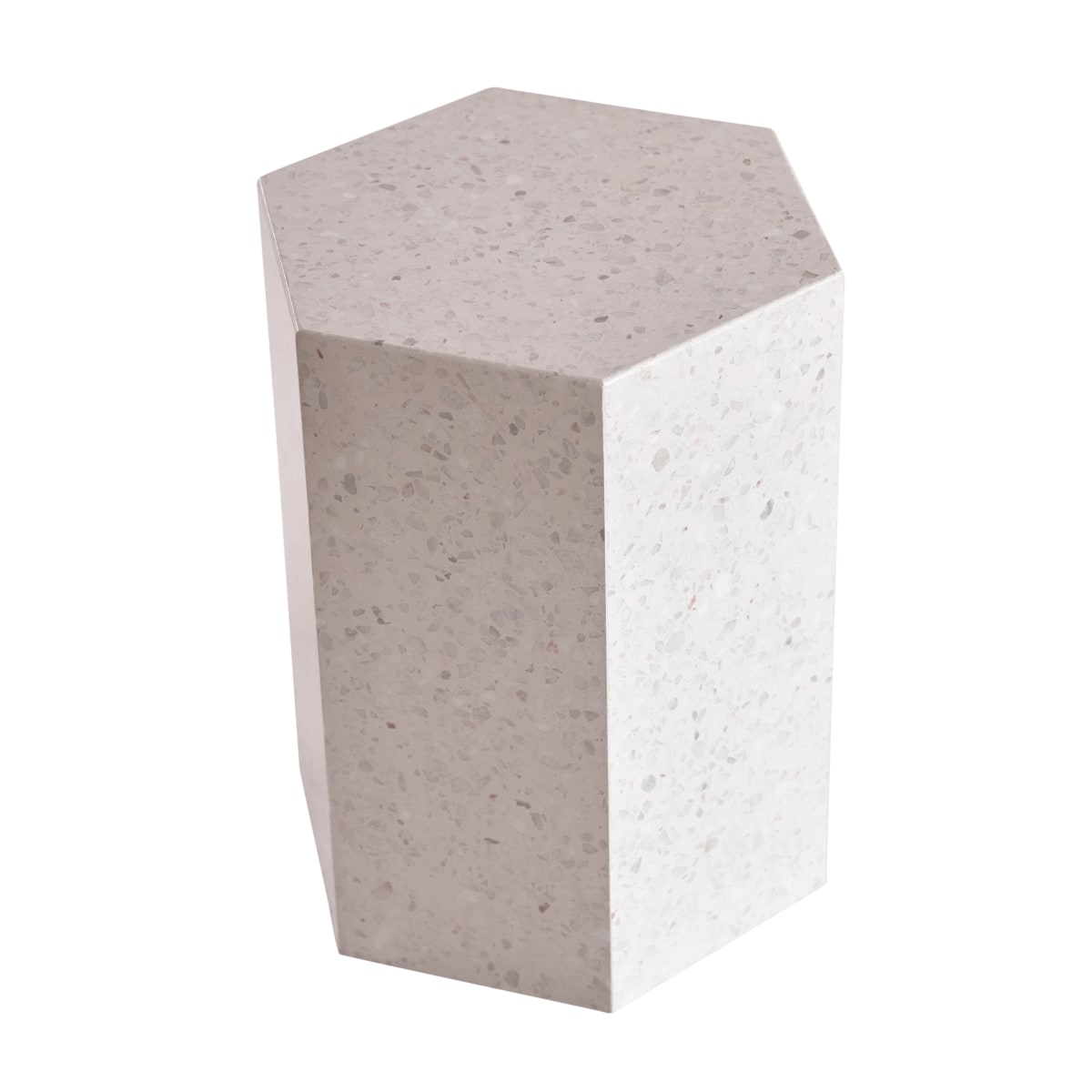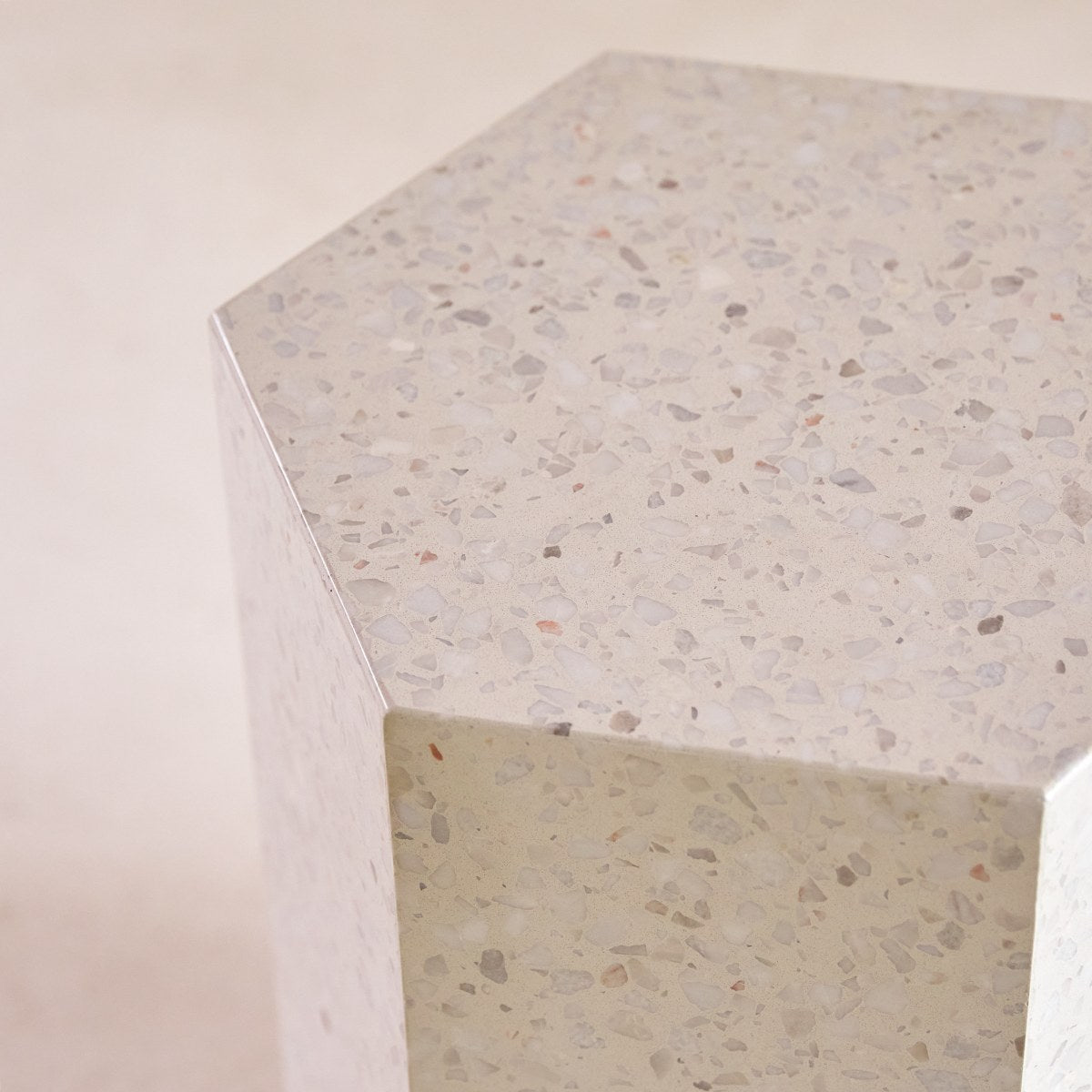 Ontdek de Zoé-hocker van premium terrazzo, een bijzonder meubelstuk dat moderniteit en elegantie combineert. Het oppervlak van witte gespikkelde premium terrazzo biedt een unieke en verfijnde look. Deze hocker is zowel praktisch als decoratief en ideaal om een vleugje chic toe te voegen aan uw woonkamer.