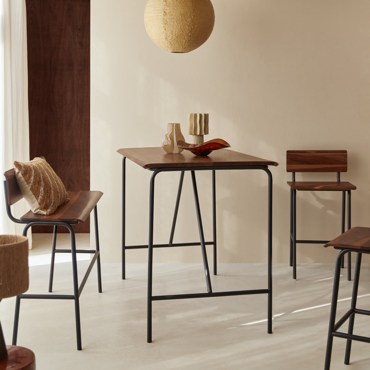 De hoge tafel Talia van metaal en massief palissander ziet eruit alsof hij rechtstreeks uit een werkplaats uit het industriële tijdperk komt!