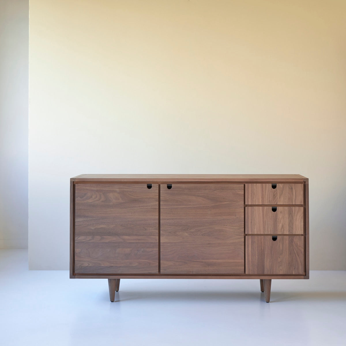 Het Scandinavisch geïnspireerde buffet Jonák van massief notenhout is vooral aantrekkelijk door zijn nobele houtkwaliteit en mooie goudbruine accenten. We houden ook van de grafische nerven, de matte afwerking, de ruime opbergruimte en het strakke design. Ideaal in de eetkamer om servies en tafellinnen op te bergen, maar ook perfect in een grote keuken of een ruime woonkamer.