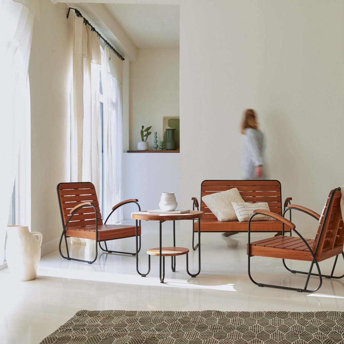 De Key Wood loungeset in massief acaciahout past in de In and Out trend, die de voorkeur geeft aan meubilair dat zowel binnen als buiten prachtig staat: in de woonkamer kunnen deze fauteuils en banken worden verfraaid met een paar kussens en een plaid... op het terras kunt u hier in de zomer koel zitten tijdens lange, gezellige avonden. Deze industrieel geïnspireerde loungeset zit boordevol karakter en bestaat uit 2 fauteuils + 1 bank + 1 salontafel met dubbel blad. Alle meubels in deze set zijn behandeld met olie om hun schoonheid te behouden en voor dagelijks gebruiksgemak. We houden van de opvallende combinatie van metaal en hout, de ronde lijnen en het ontwerp met lamellen van de zittingen, die erg in de mode zijn in moderne interieurs.