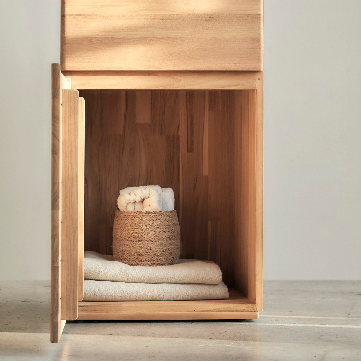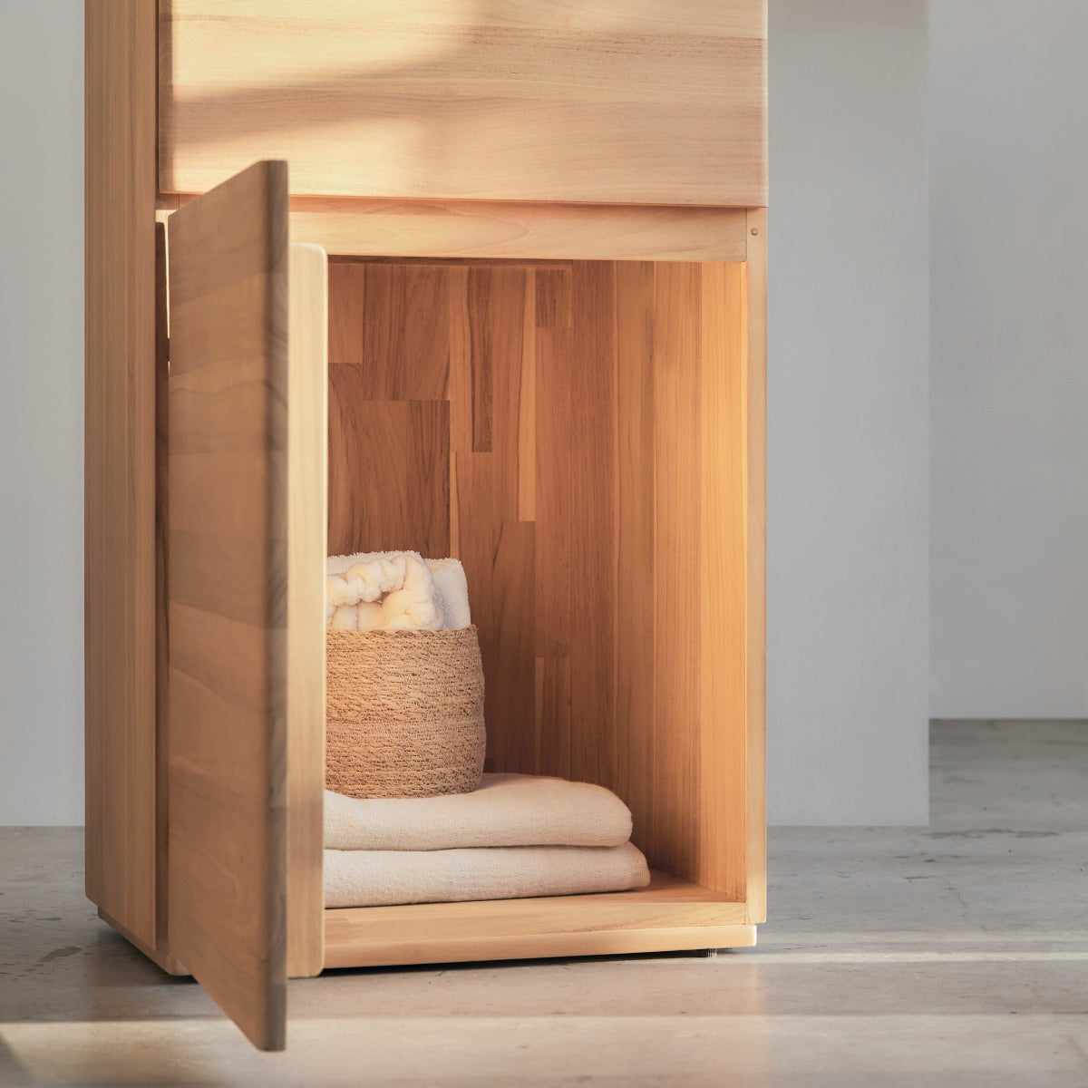 De Nino kolomkast in FSC®-gecertificeerd massief teakhout is niet alleen praktisch maar ook elegant. De ruwe afwerking versterkt het natuurlijke karakter van het hout en creëert een warme sfeer.