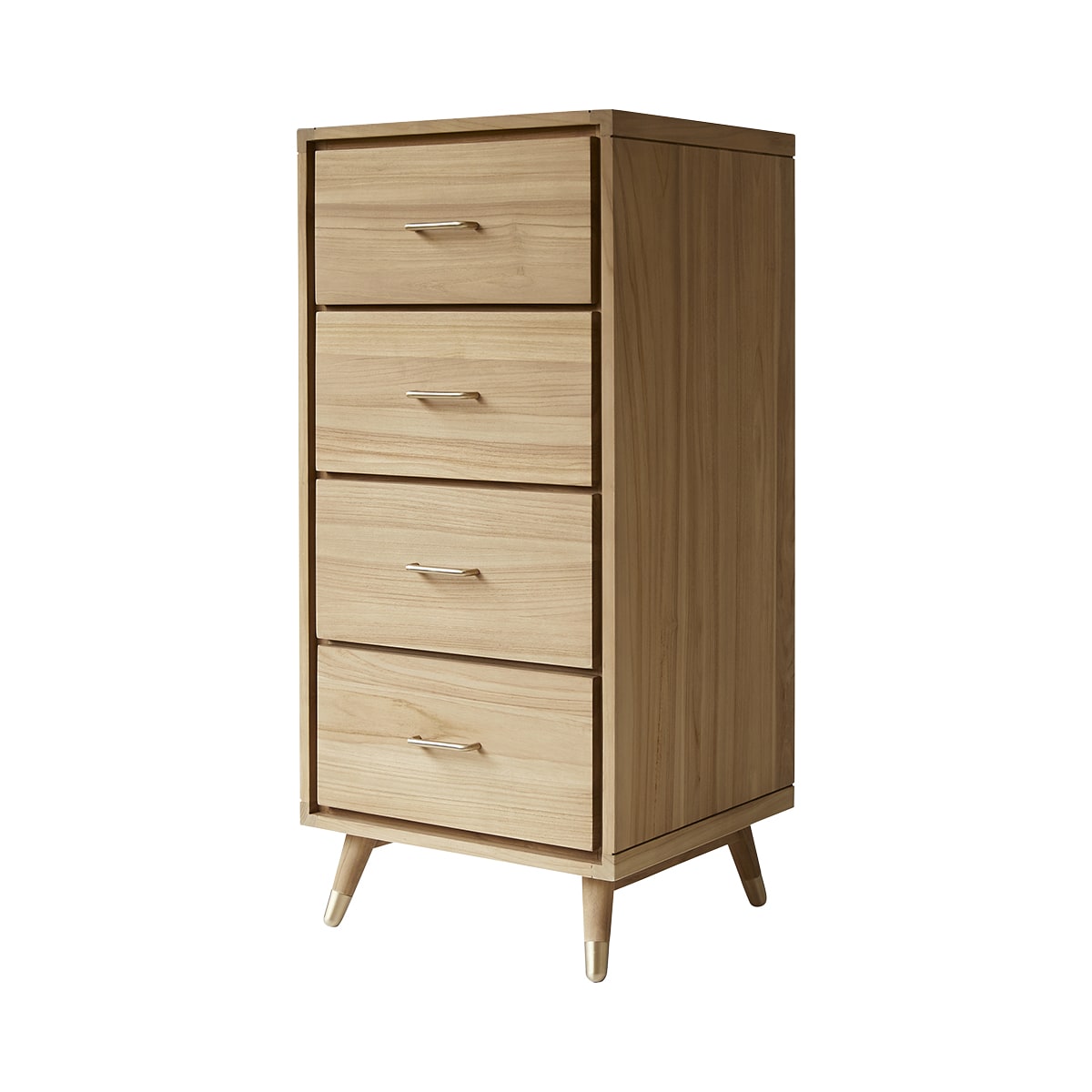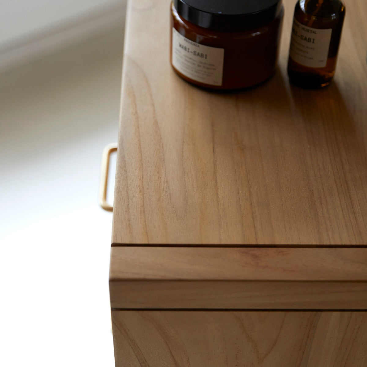 Ontdek onze ladekast Kort van Massief teakhout met FSC-certificaat<sup>®</sup>. Ideaal opbergmeubel met 4 laden op metalen rails waarin u uw tafellinnen of documenten kunt opbergen. Staat erg goed in zowel de slaapkamer als de woonkamer.