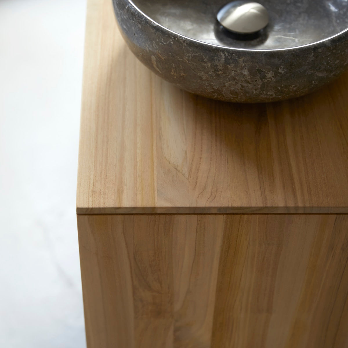 Het badmeubel Kwarto 110 is gemaakt van massief ruw teakhout uit Indonesië. Dit perfecte opbergmeubel is voorzien van een grote open nis en 2 laden en is ideaal voor uw badkamer. De hedendaagse stijl en de zeer elegante klassieke ontwerplijnen zullen u zeker bekoren. De charme van dit meubel zit ook in zijn natuurlijke beige kleur. Voor de praktische kant bevat ons meubel ook een open onderkant waar u manden en opbergboxen in kunt schuiven.