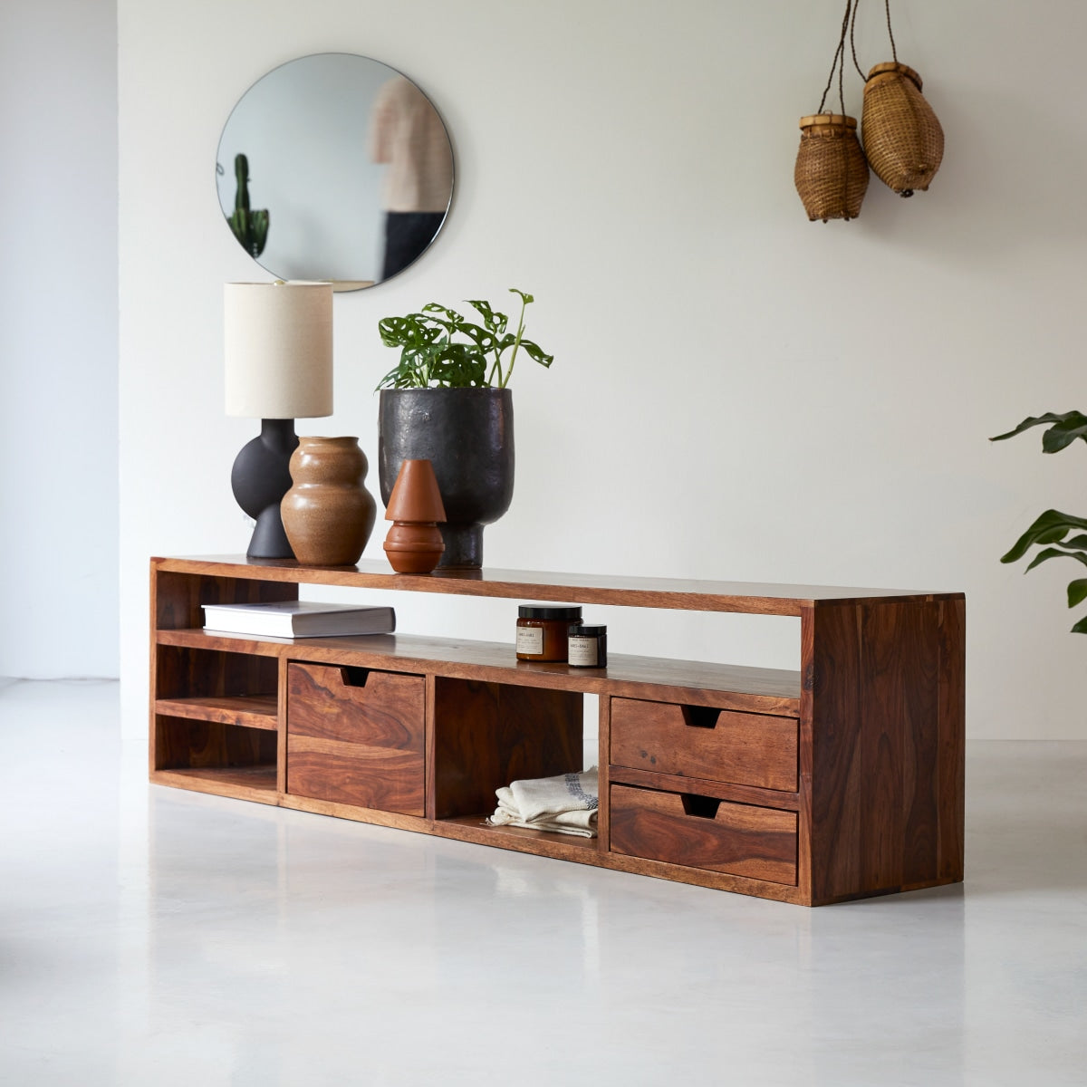 Groot tv-meubel van palissander, met een warme en kleurrijke tint. Voorzien van meerdere open opbergvakken: 1 groot vak boven, 4 kleine vakken aan de zijkant en 2 centrale vakken (verkocht met 2 laden en 1 bak), ideaal voor het optimaliseren van de ruimte in uw woonkamer.