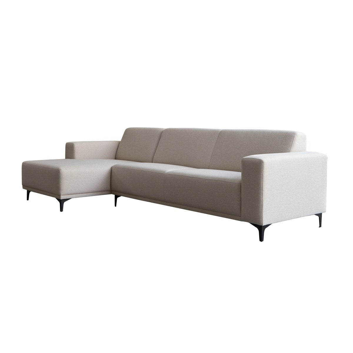 Hoekbanken zijn erg populair omdat ze de ruimte in een grote woonkamer of zitkamer afbakenen... De hoekbank (links) in ecru stof Lars is ideaal voor een leuke avond met familie of vrienden en nodigt echt uit om te ontspannen! Hij heeft strakke lijnen, heldere kleuren en een fijn geweven stof die zacht aanvoelt en OEKO-TEX® gecertificeerd is, de garantie dat het geen schadelijke chemicaliën bevat. De metalen poten laten het geheel visueel lichter lijken.