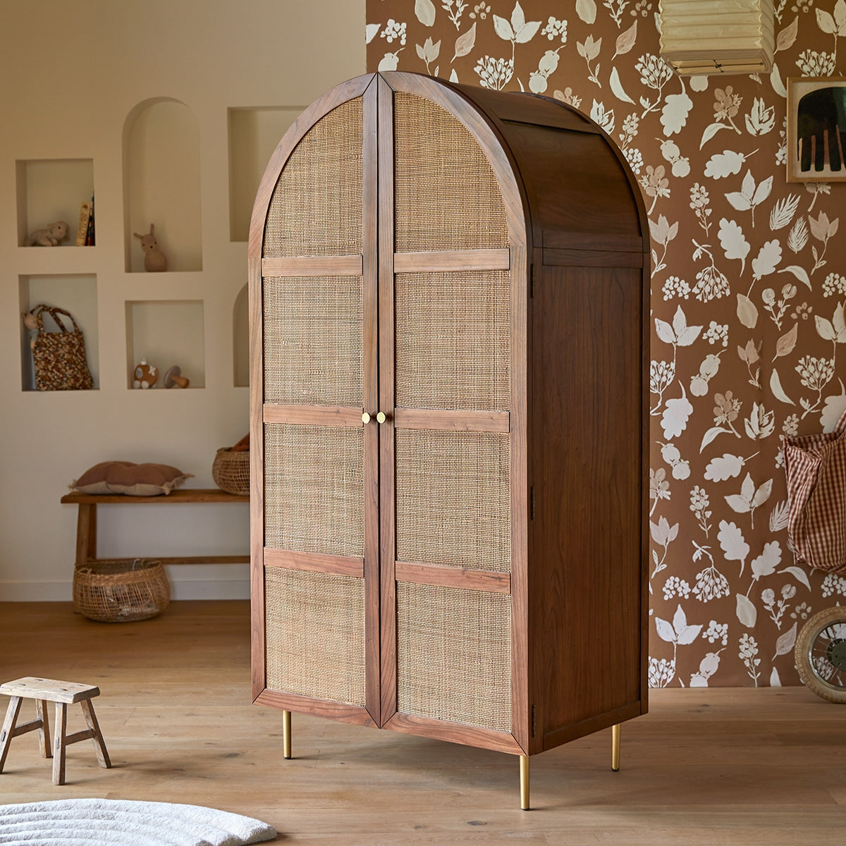 De kast Lisbeth van iepenhout en rotan met zijn zachte rondingen nodigt kinderen uit om te dromen en moedigt hen aan om kleren of speelgoed op te ruimen: zou de fascinerende pratende paraplu van Mary Poppins zich achter de deur kunnen verbergen? Opruimen is zoveel makkelijker als je er plezier in hebt! De kast van iepenhout en gevlochten rotan is gelakt en daardoor goed schoon te maken. Aangezien rotan tegenwoordig een essentieel onderdeel is van interieurs, stellen we u voor er een complete kamer mee in te richten die uitnodigt tot spelen en ontdekken: een geweldig idee waar uw kinderen dol op zullen zijn. Combineer daarvoor de kast Lisbeth van iepenhout en rotan met andere neo-etnisch geïnspireerde meubels. Dit prikkelt niet alleen de verbeelding, maar brengt ook een vleugje exotisme in hun kamers.