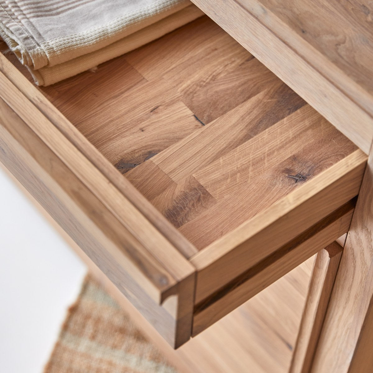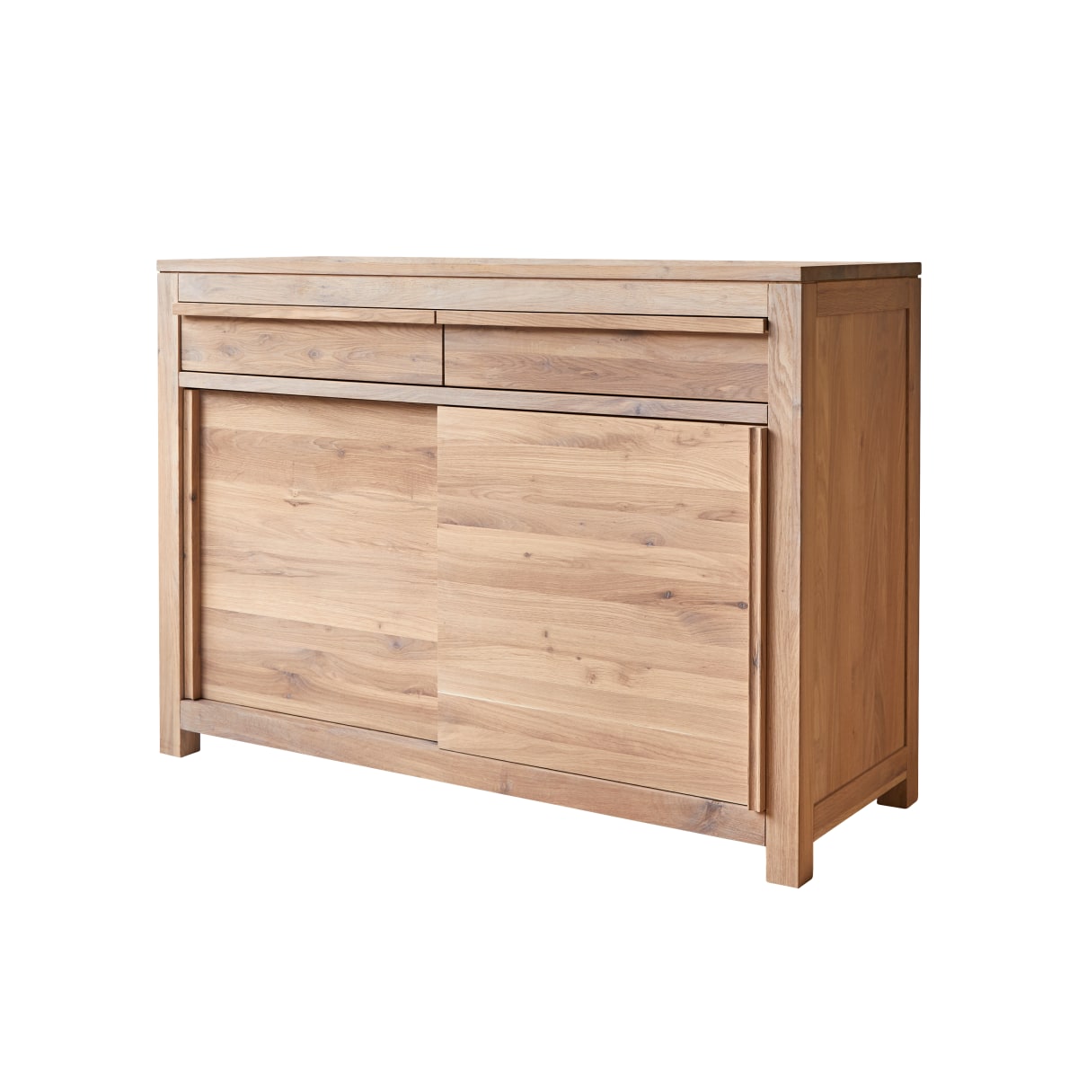 Het is gemaakt van FSC® gecertificeerd massief eikenhout - de garantie dat het afkomstig is uit verantwoord beheerde bossen - en heeft een voedende geoliede afwerking om het te beschermen tegen dagelijks gebruik en om het gemakkelijk te onderhouden. De massief eiken buffetkast is ook verkrijgbaar in een grote versie, 150 cm.