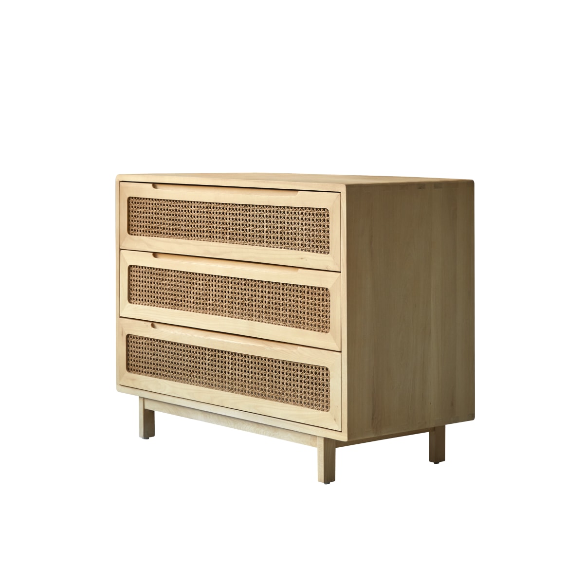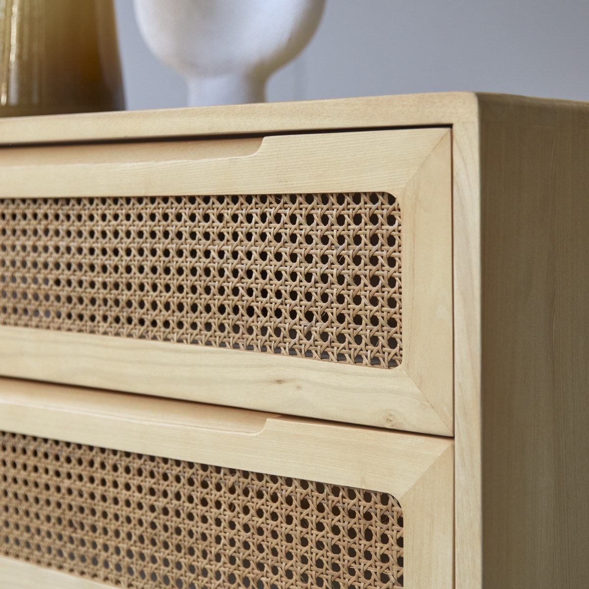 De Luis ladekast van massief iepenhout en riet. Sinds enige tijd maakt riet een comeback in onze hedendaagse interieurs! Hier wordt het gecombineerd met een nobele karaktervolle houtsoort voor een meubelstuk dat in elke kamer van het huis kan worden gebruikt: in de woonkamerwordt er bijvoorbeeld tafellinnen, glazen en zoute koekjes in bewaard... in de slaapkameris het geschikt voor kleine kledingstukken, beddengoed…