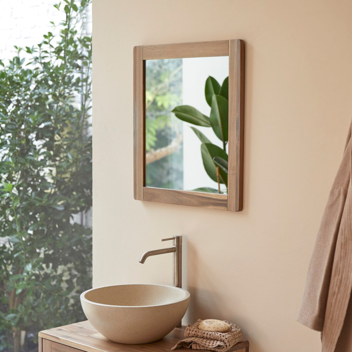 De Lila spiegel van massief FSC®-gecertificeerd acaciahout combineert natuurlijke charme met een strak design. Zijn lichte kleur en sobere lijnen passen bij elke stijl, of hij nu wordt gebruikt om een ruimte groter te laten lijken of boven een wastafel. Hij is gelakt voor een gemakkelijk onderhoud en past dankzij de elegantie van de Lila collectie echt overal in huis.