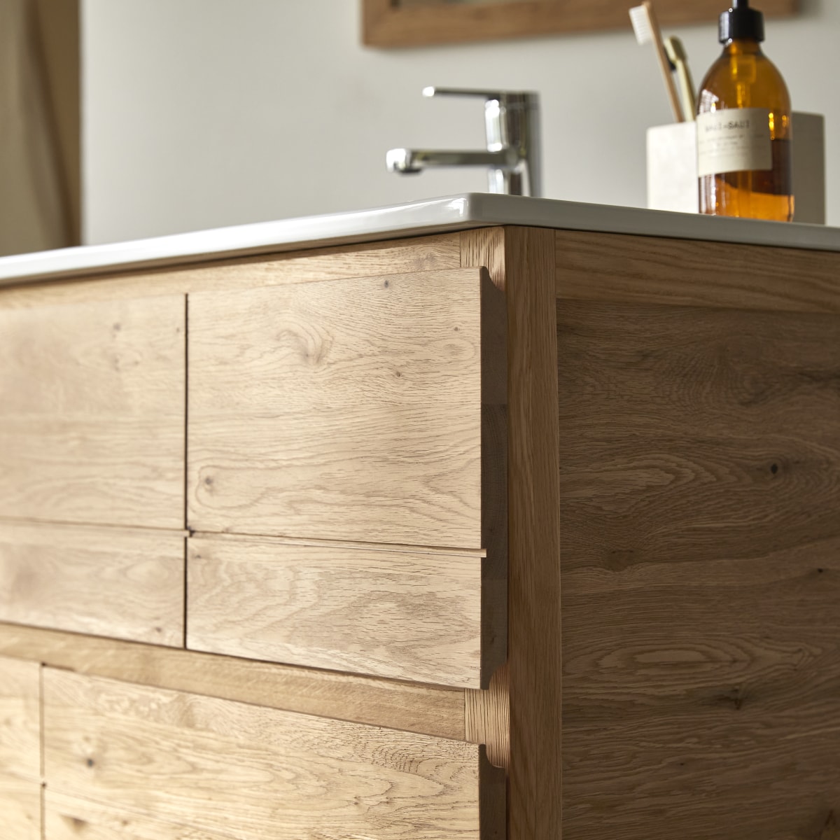 Ons elegante Easy Solo badkamermeubel is gemaakt van massief FSC®-eikenhout en heeft een keramisch blad. Dankzij de 2 laden kunt u uw badkamerspullen zoals linnengoed en cosmetica opbergen. Met de zowel stijlvolle als praktische meubelwastafel hebt u een 2-in-1 meubel. Het elegante ontwerp wordt gekenmerkt door de combinatie van eikenhout en keramiek, een combinatie die zowel origineel als verfijnd is.