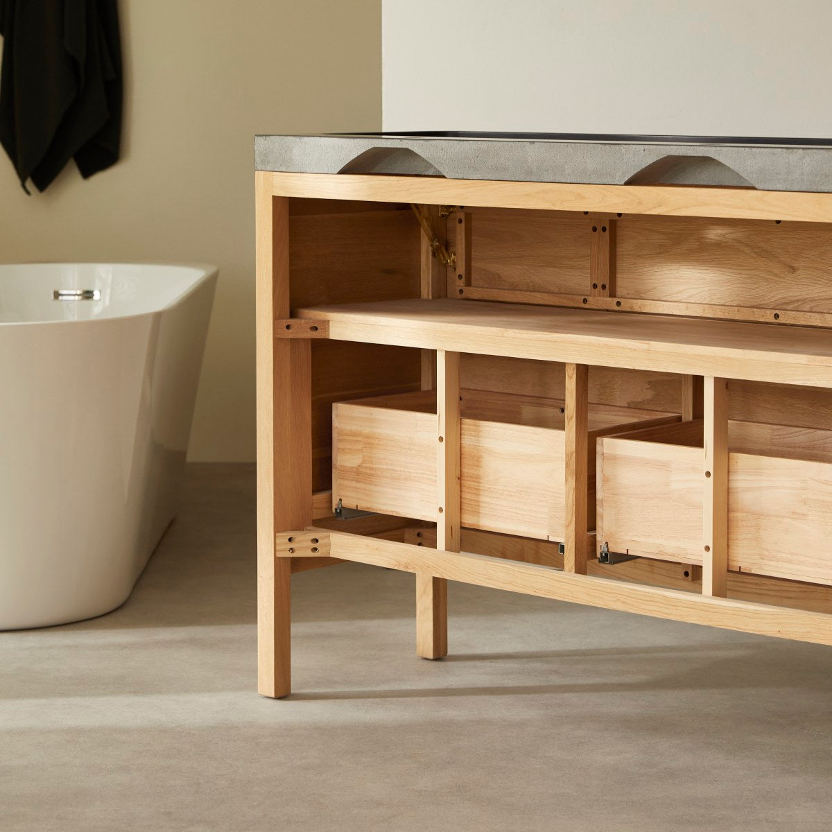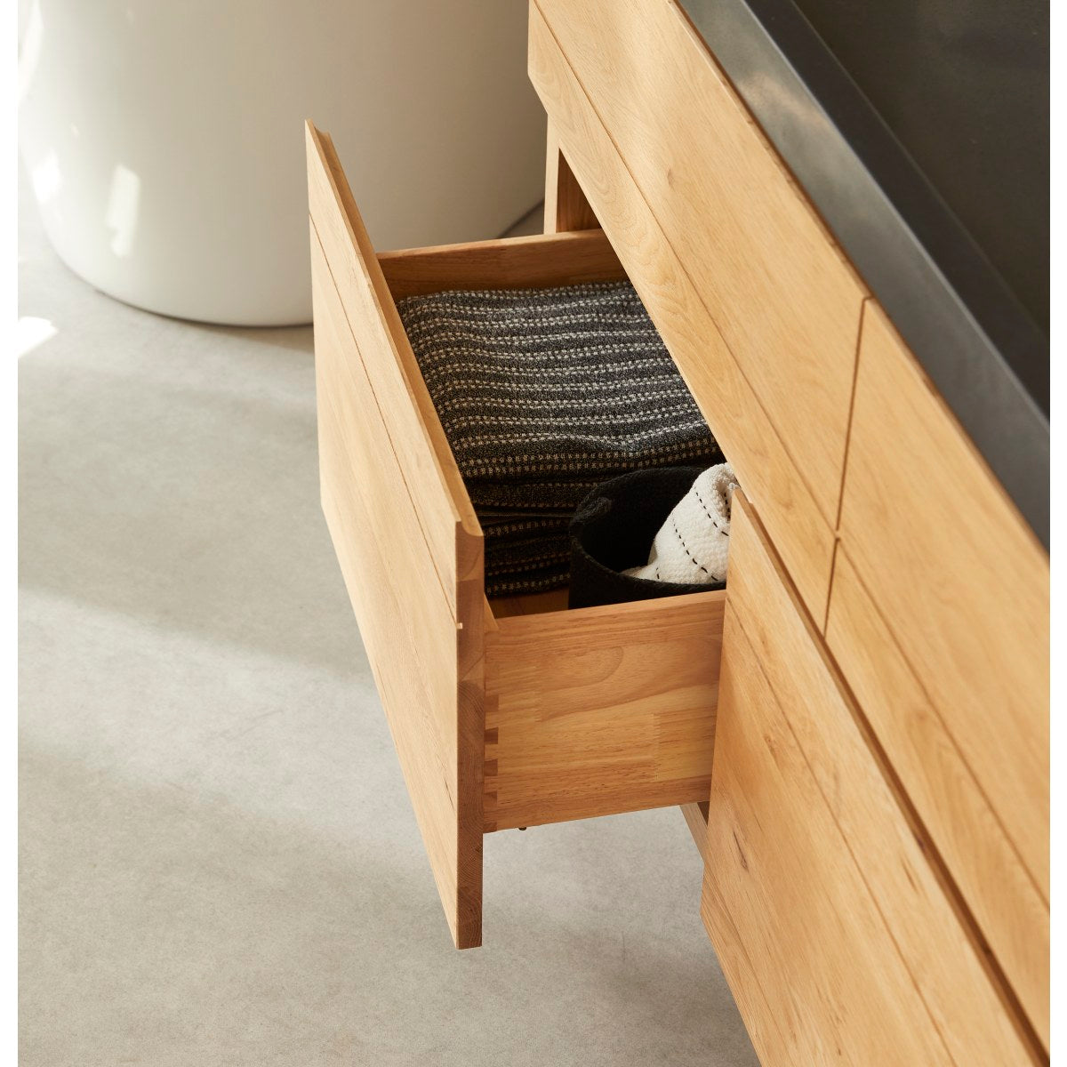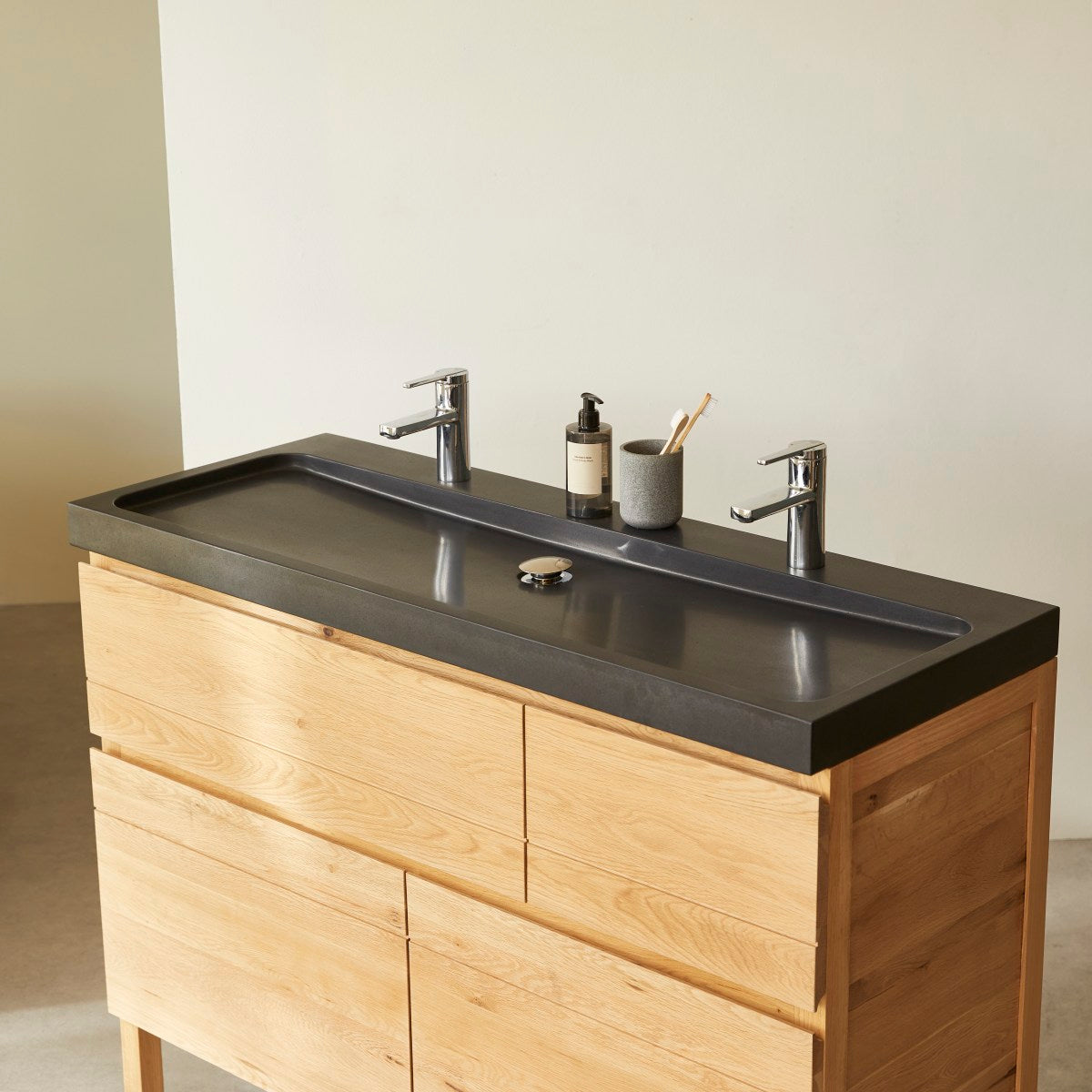Ontdek ons Easy Duo badmeubel van massief FSC®-eikenhout met een blad van lavasteen. Ons badkamermeubel dat voorzien is van 2 laden om al uw benodigdheden zoals linnengoed en schoonheidsproducten te bewaren, is een echt opbergmeubel. Dankzij de brede meubelwastafel kan dit meubel gemakkelijk door twee personen worden gebruikt en is het ideaal voor de badkamer van een gezin of een stel. Het elegante ontwerp wordt gekenmerkt door de sobere en verfijnde lijnen en de hedendaagse stijl zal uw interieur een moderne en tijdloze toets geven.