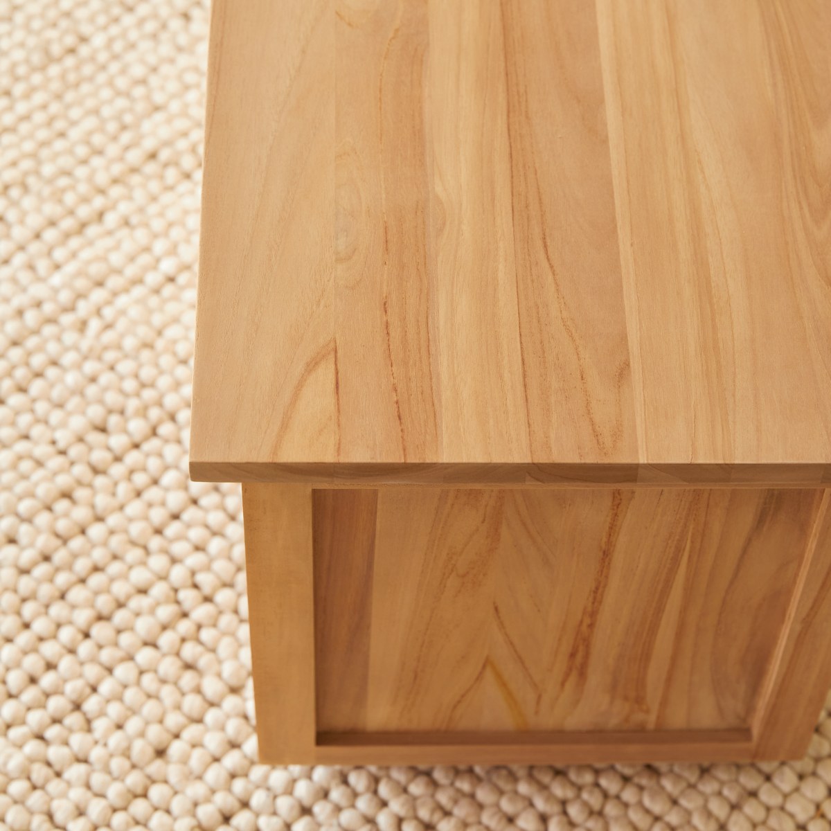 De Suzette massief teakhouten opbergkist combineert elegantie en functionaliteit met veel opbergruimte. Het trendy lattenontwerp benadrukt de natuurlijke blonde kleur van het FSC®-gecertificeerd hout.