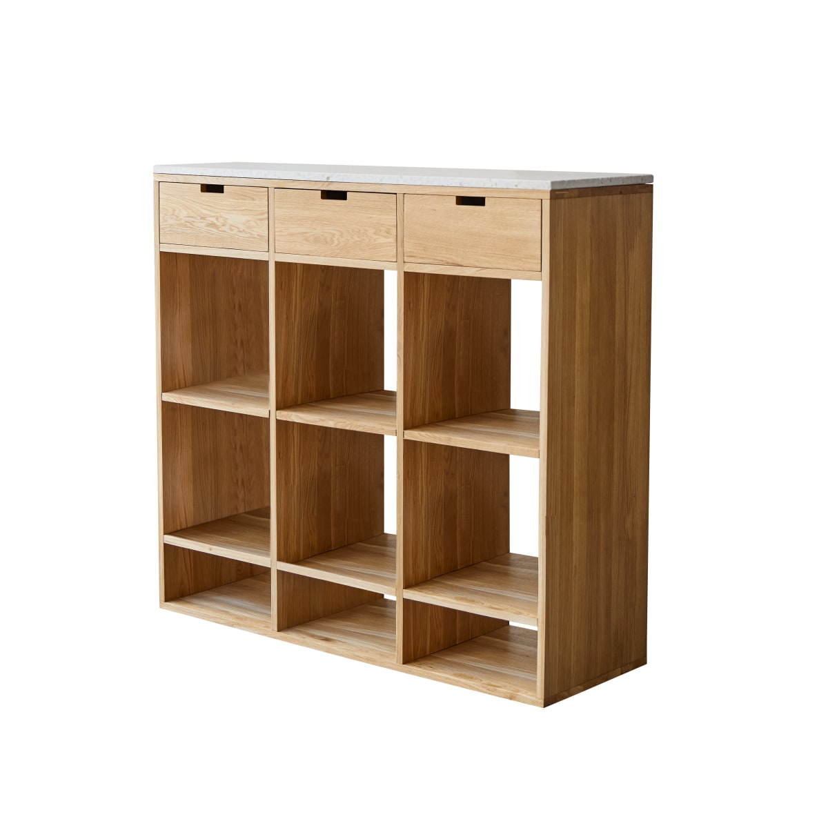De lage boekenkast Miho in eiken en wit premium terrazzo is ideaal voor elke kamer in huis en past zich aan uw behoeften aan... in de woonkamer, eetkamer of slaapkamer kunt u hem tegen een scheidingswand of in het midden plaatsen om de ruimte op te delen: de lades - handig om alles op te bergen wat u niet in huis wilt hebben rondslingeren -ze openen aan beide kanten en kunnen boven of onder in het meubel worden geplaatst. Door het bovenblad in premium terrazzo, een onderhoudsvriendelijk, duurzaam materiaal dat net zo mooi is als marmer, kunt u uw groene planten uitstallen zonder dat u hoeft te vrezen voor waterschade door water geven. De Miho boekenkast past ook heel vanzelfsprekend in de keuken, waar het bovenblad een werkblad wordt.