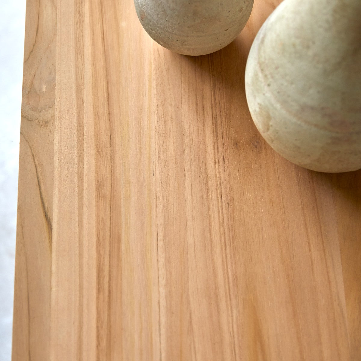Groot tv-meubel met massieve teakhouten latten met FSC-certificaat®. Deze houten meubelen passen in uw woonkamer, gecombineerd met de salontafel uit dezelfde collectie, en introduceren charme en gezelligheid in uw interieur.