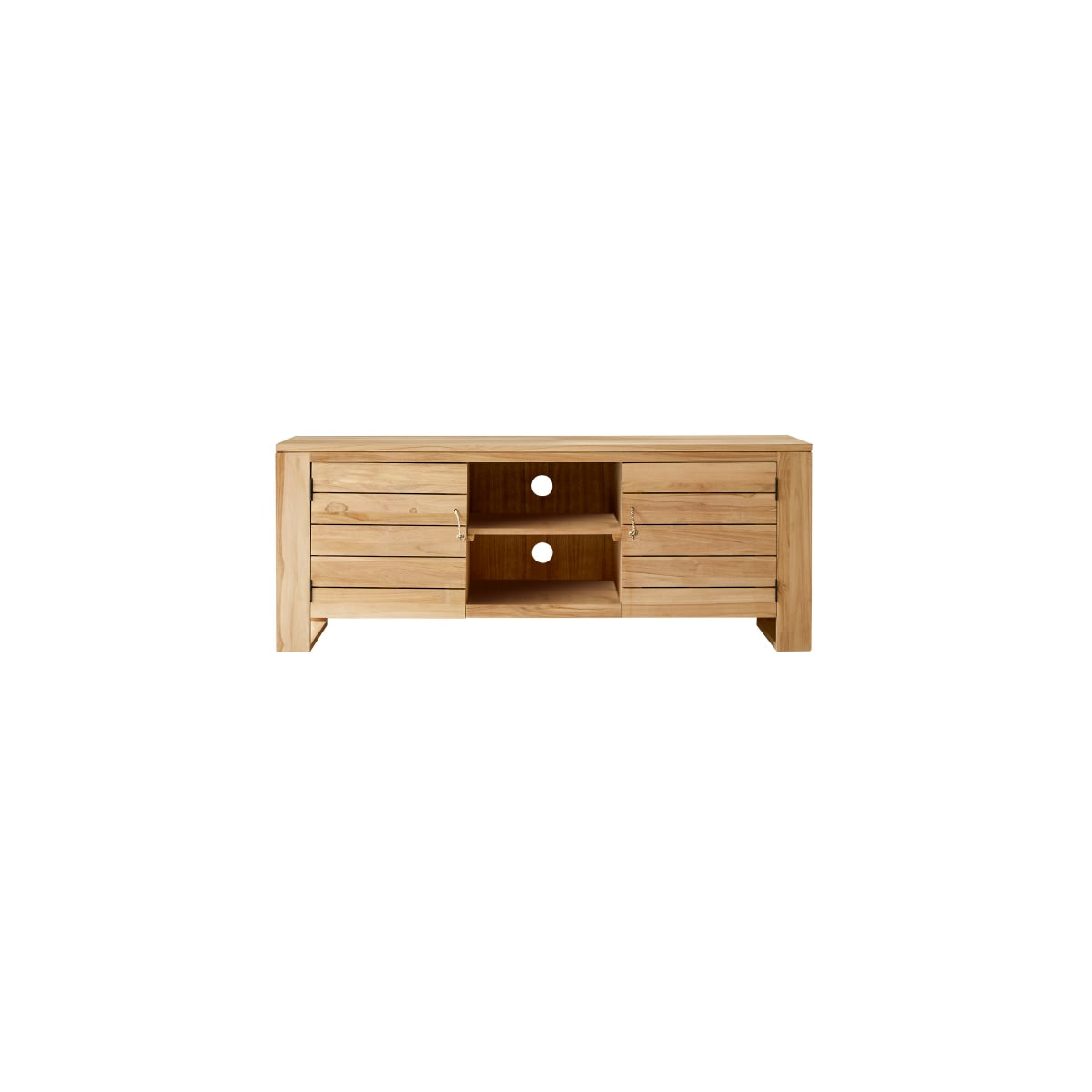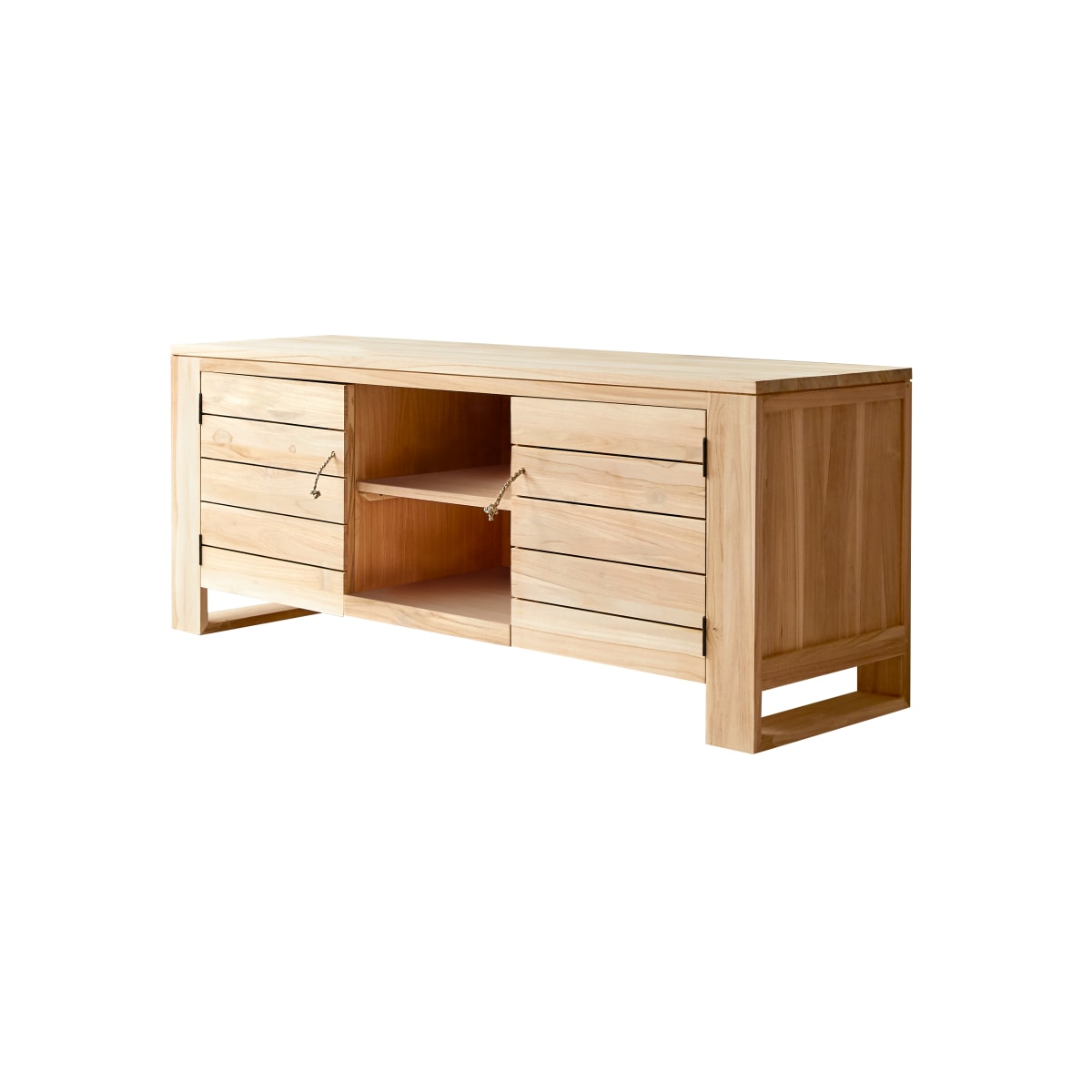 Geïnspireerd door een sober en eigentijds ontwerp, dit tv-meubel van teakhout combineert praktisch en elegant op perfecte wijze. Uitgerust met 2 deuren met daarachter 1 vak en handgrepen van touw, 2 centrale vakken.