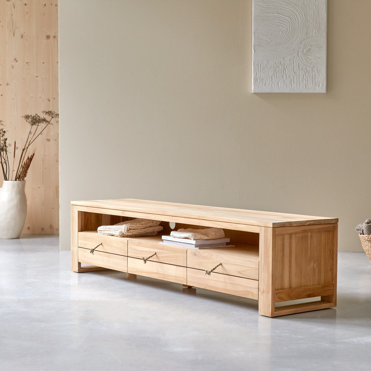 Dit tv-meubel van teakhout is een perfecte combinatie van functionaliteit en elegantie, onderdeel van de Minimalys collectie: kwaliteit en stijl volgens Tikamoon!