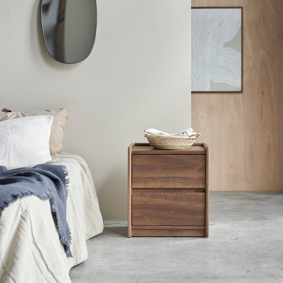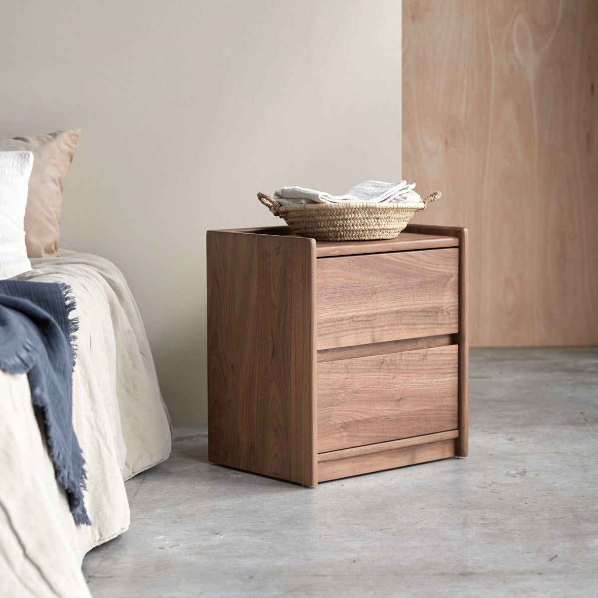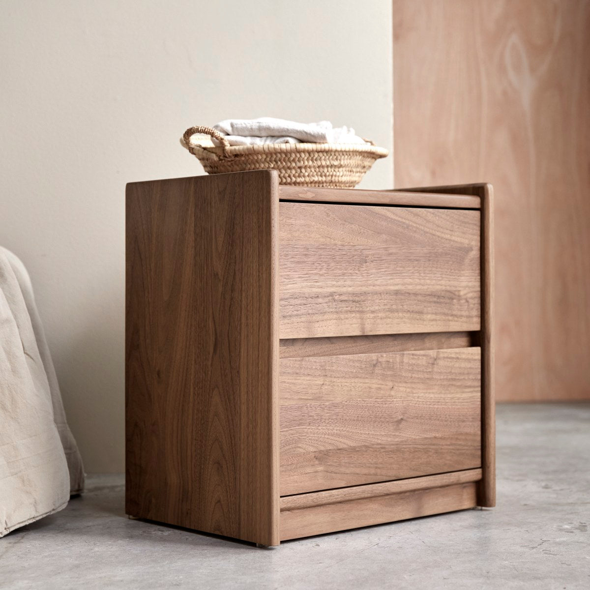 Het Arto nachtkastje met 2 lades van massief notenhout, gekozen door Tikamoon, combineert tijdloze elegantie met natuurlijke charme dankzij zijn kostbare hout en geoliede afwerking.