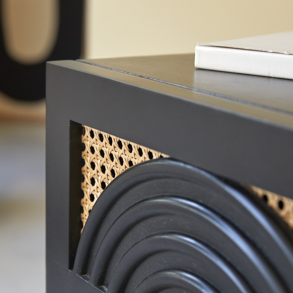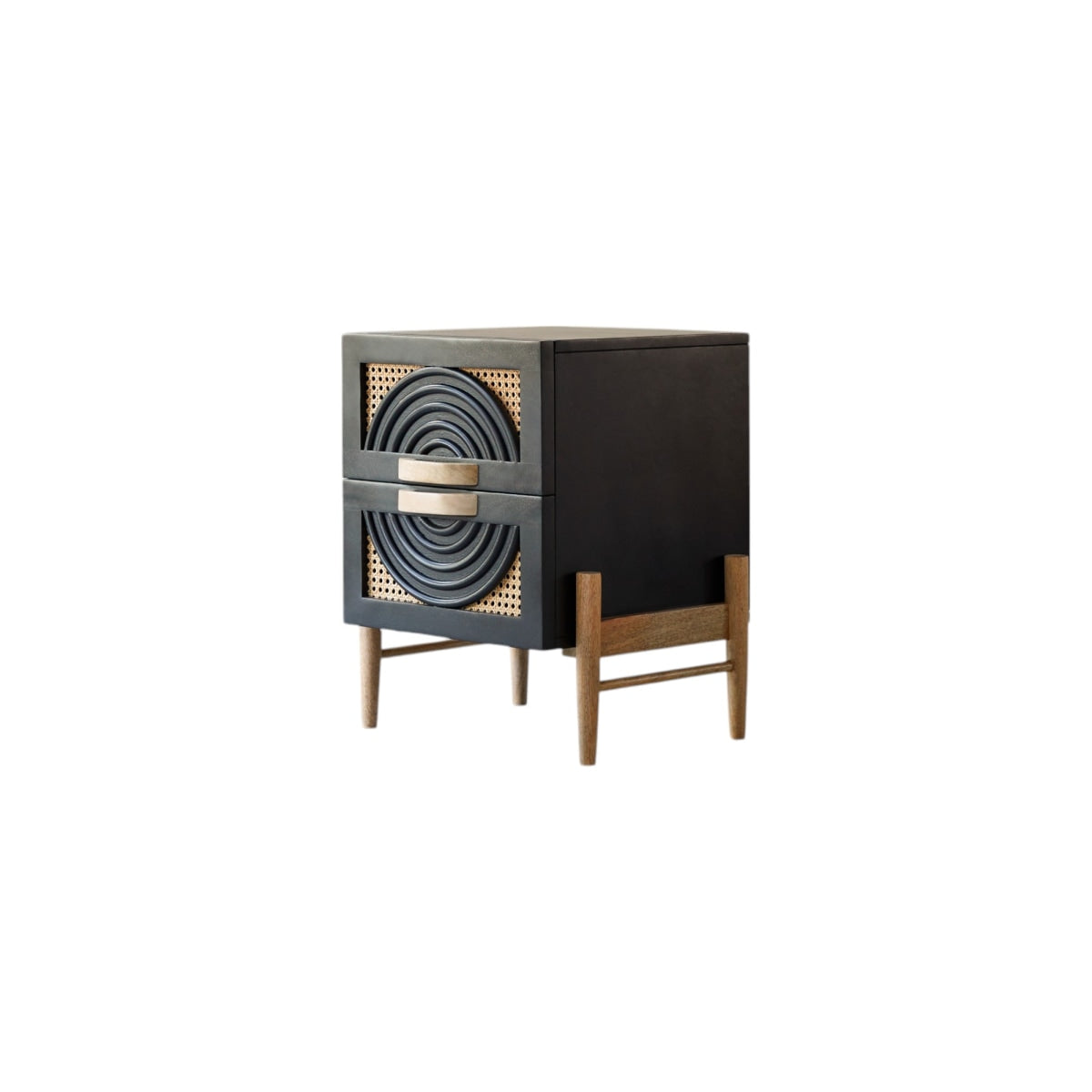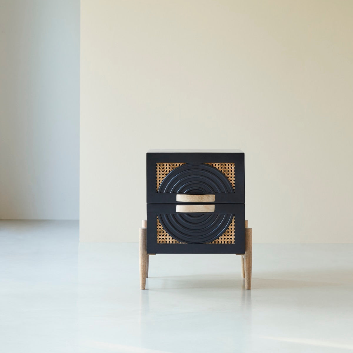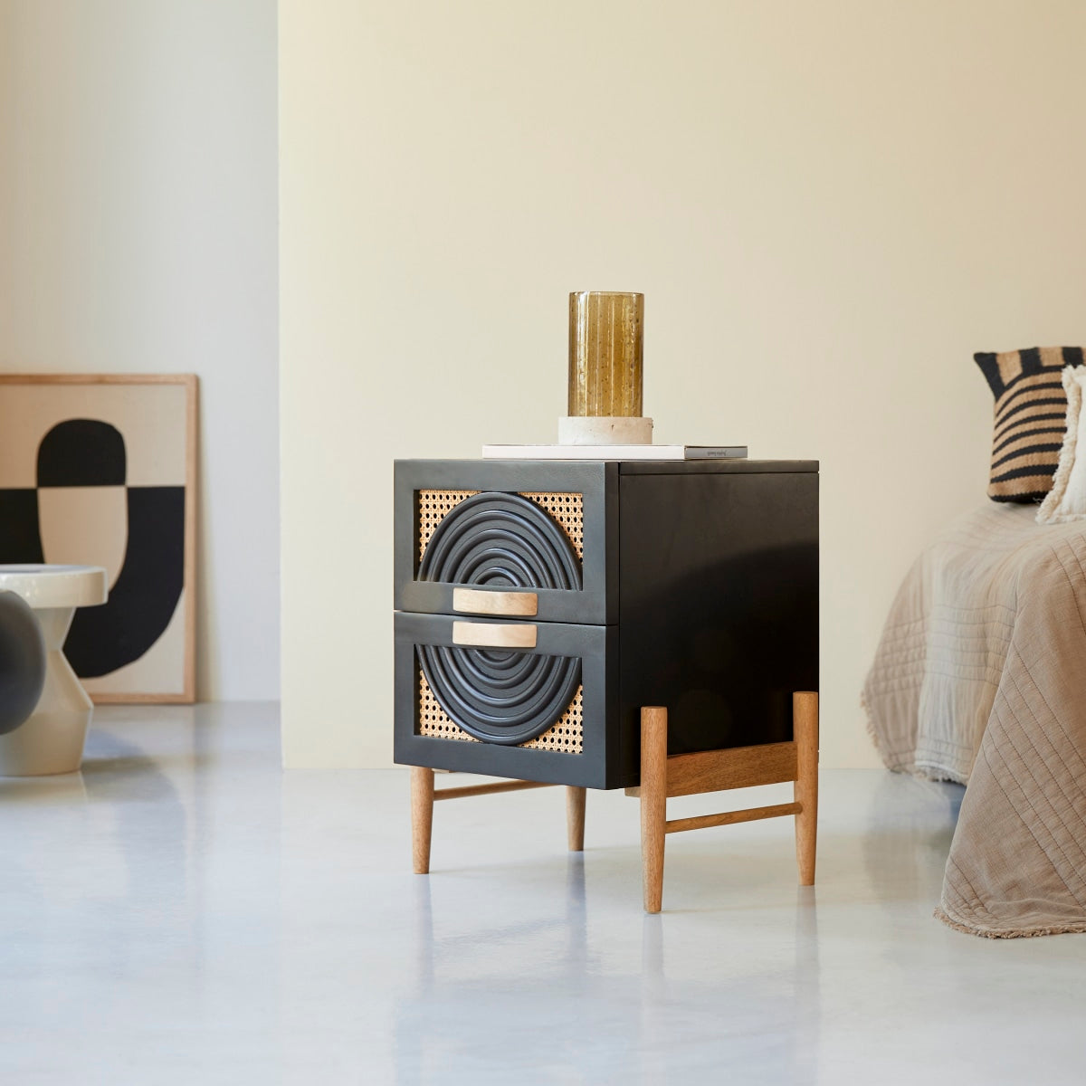 Het Sina nachtkastje van massief zwart mangohout en rotan is onweerstaanbaar met zijn moderne en neo-etnische elegantie. Met zijn twee lades en verrassende motief staat het prachtig in elke slaapkamer. Het is praktisch voor dagelijks gebruik, voorzien van een sluiting en wordt gemonteerd geleverd. Het is ideaal met rotan hoofdborden en kan ook worden gecombineerd met andere meubels uit de Sina of Neo-etnische serie voor een exotische uitstraling.