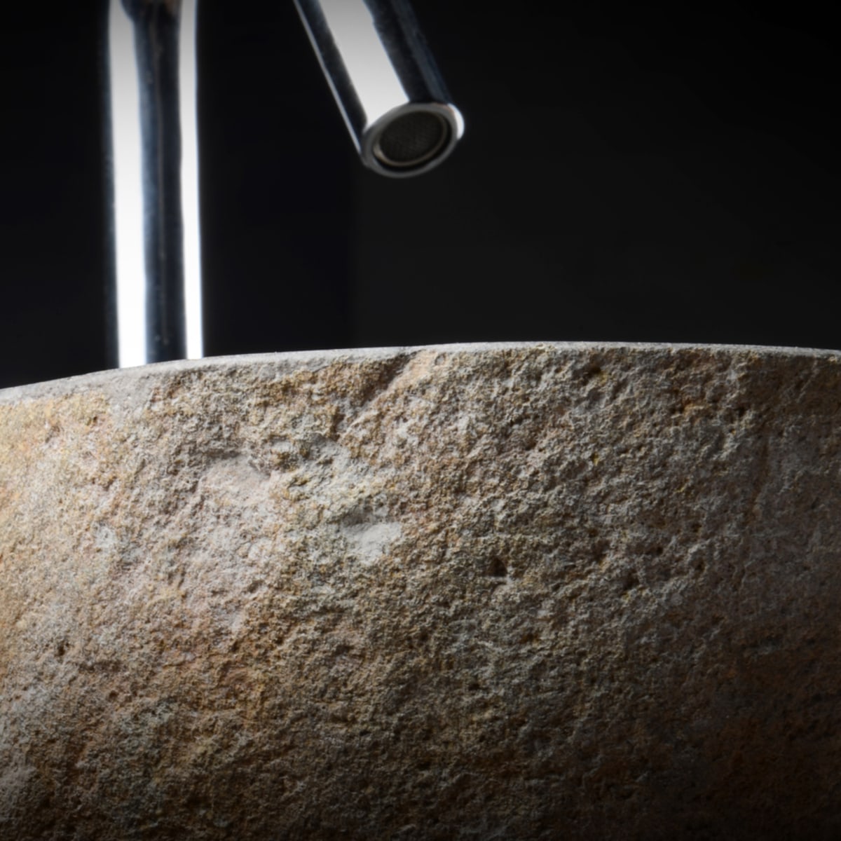 Stenen handwastafel met een origineel design. De ruwe buitenkant van deze handwastafel van riviersteen geeft het model een unieke kwaliteit. Elk stuk is uniek en heeft een andere vorm! De binnenkant is gepolijst en uitgevoerd met een afvoergat.