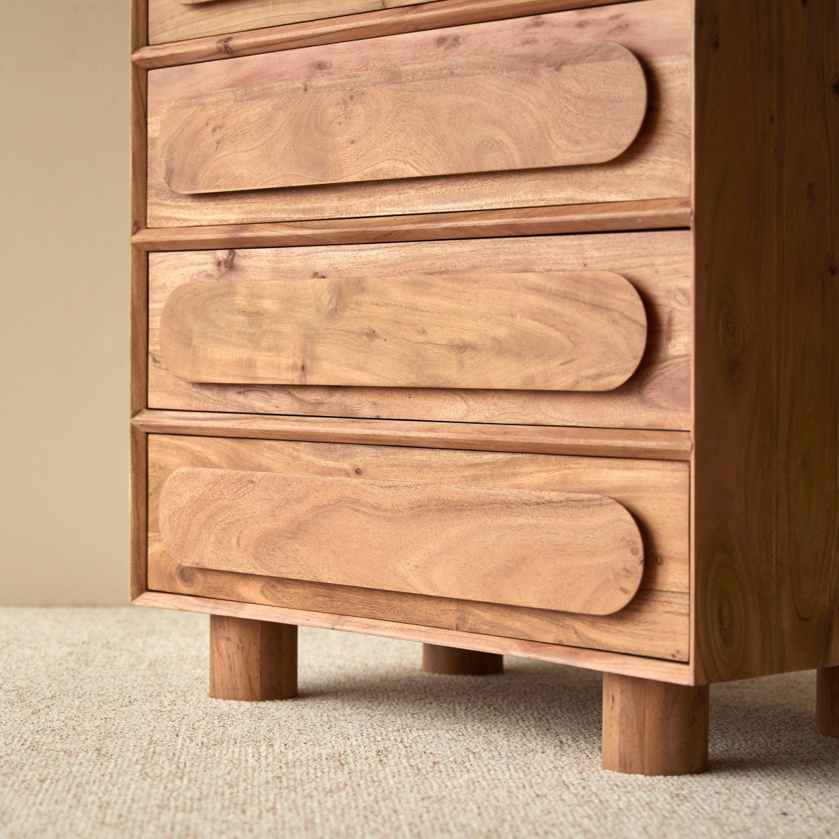 De hoge commode Olga van massief acaciahout is geïnspireerd op meubels uit verre landen en past uitstekend bij de andere stukken uit ons neo-etnische assortiment.